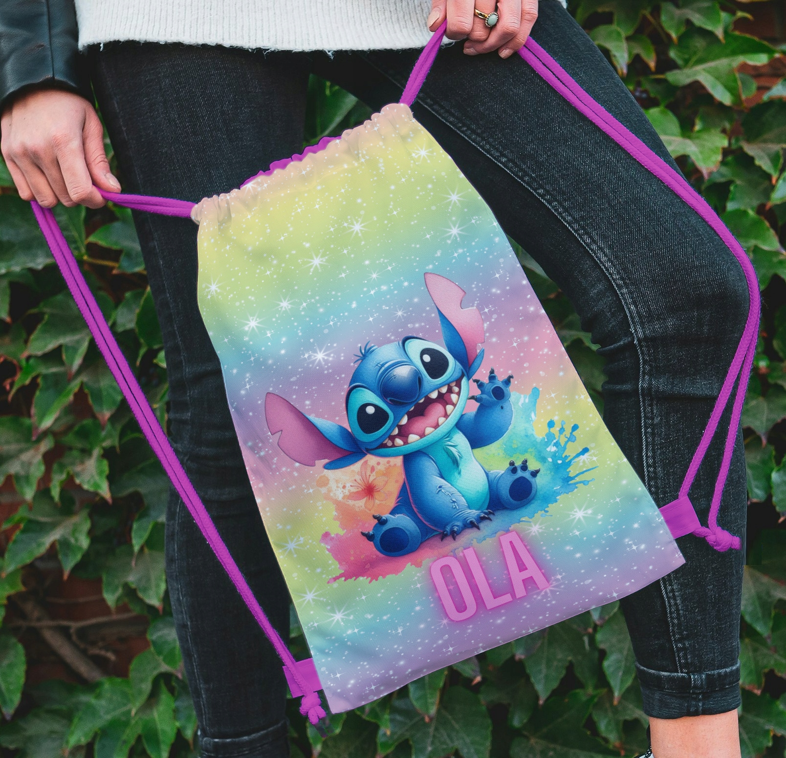 Nadruk z obrazkiem jest taki sam z obu stron workoplecaka, a imię z jednej strony pod obrazkiem.