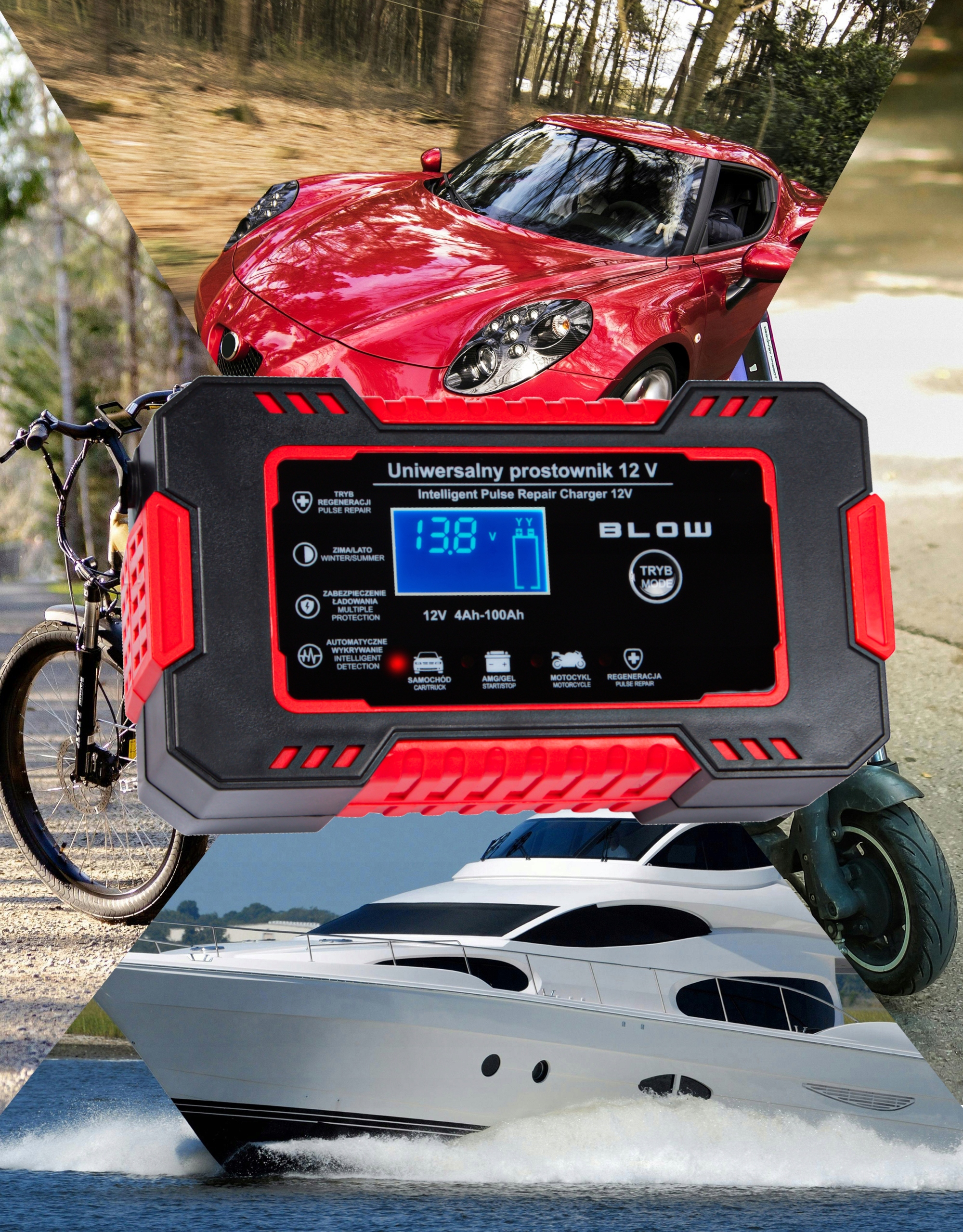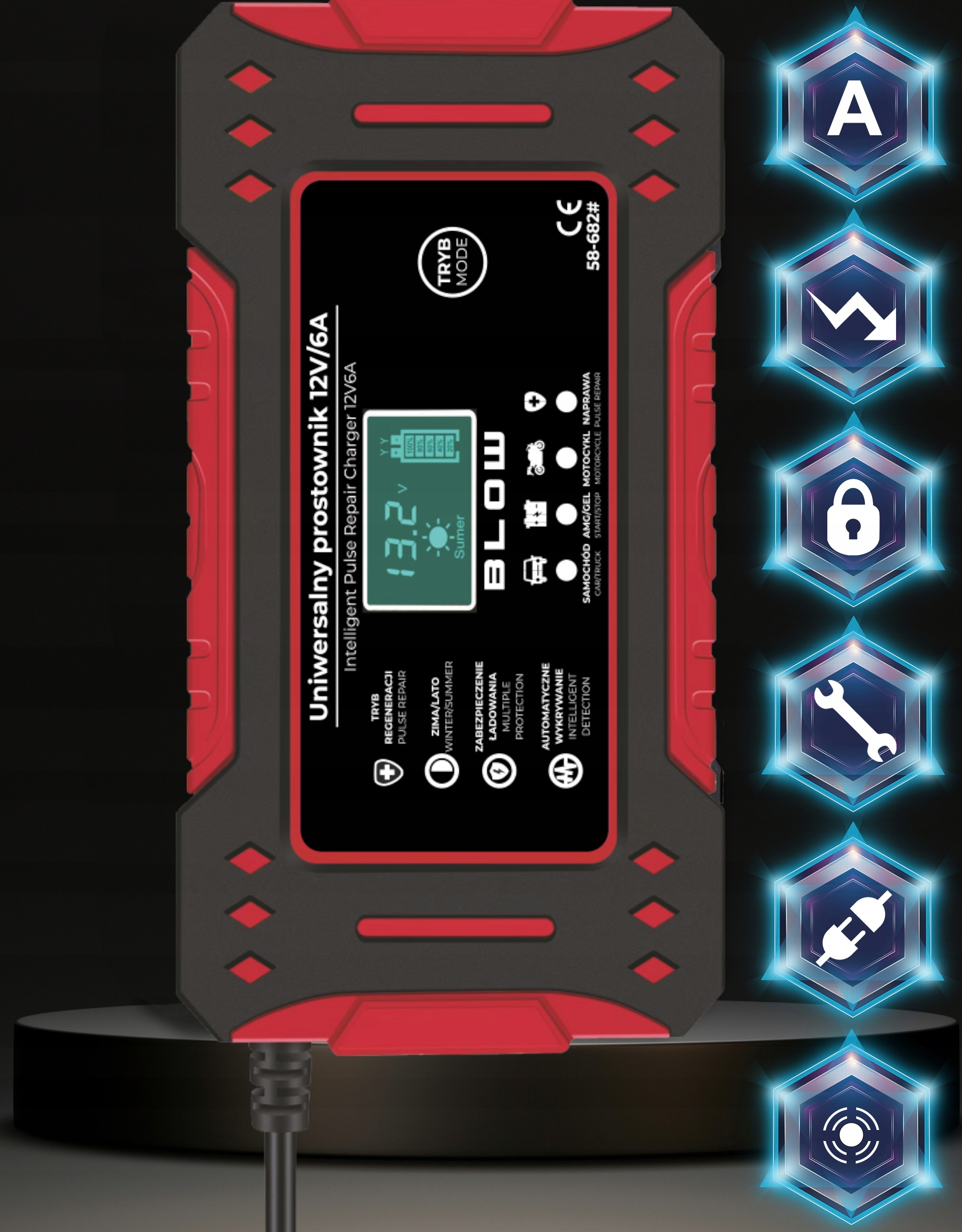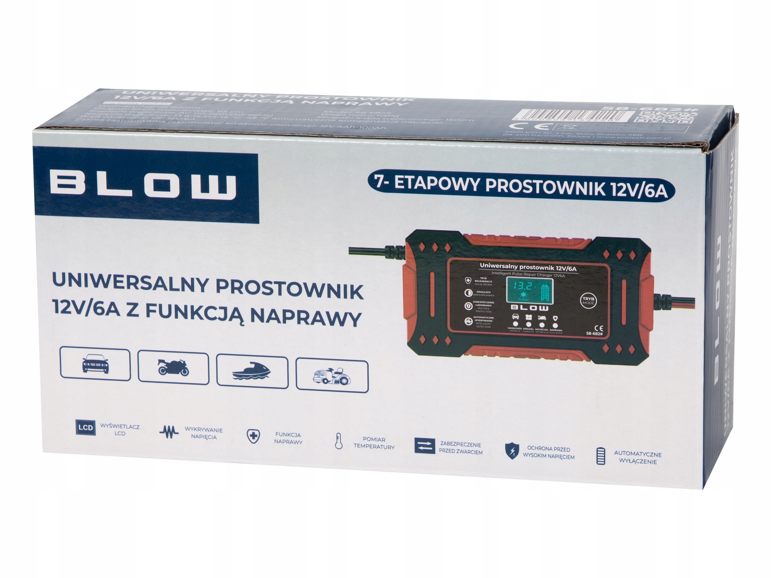 Prostownik został wyposażony w inteligentny mikroprocesor, który w razie powstania niepożądanych sytuacji mogących skutkować niebezpieczeństwem i zagrożeniem zdrowia i życia odcina moc.