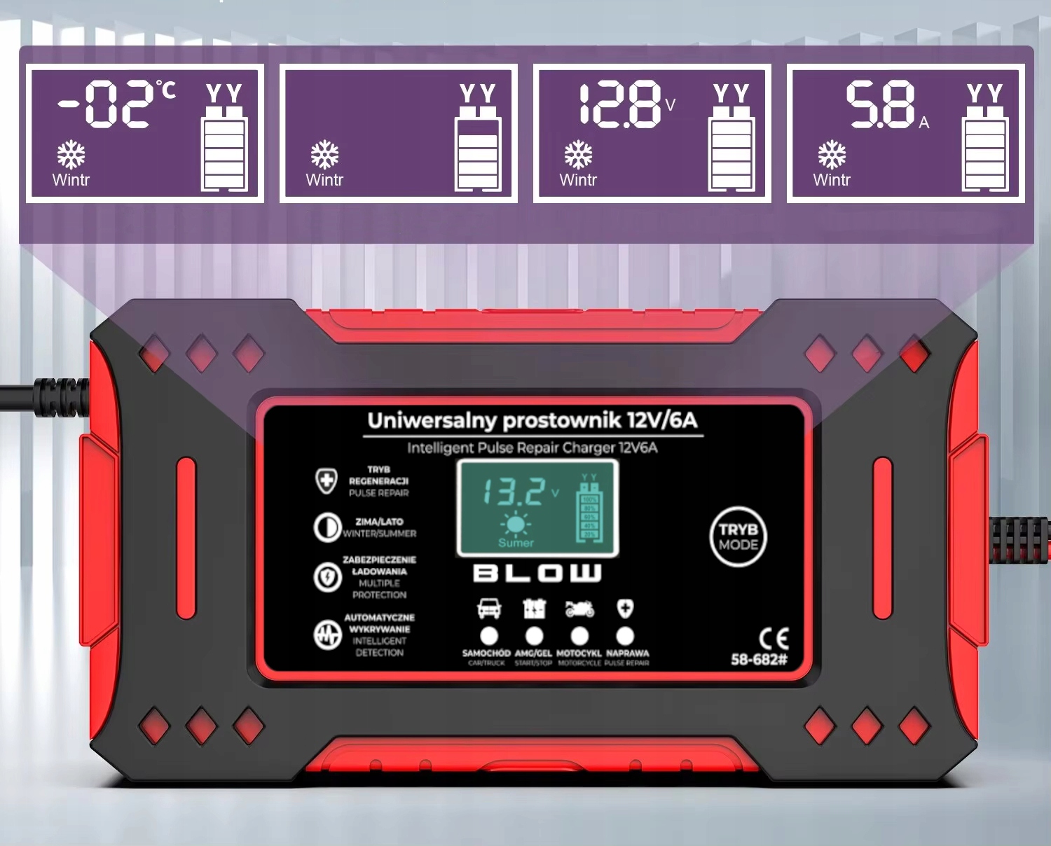 W zależności od wykrytej temperatury na ekranie podświetli się adekwatna ikonka i prostownik optymalnie naładuje podłączony pojazd/urządzenie. Prostownik dostosowany jest do trudnych warunków.