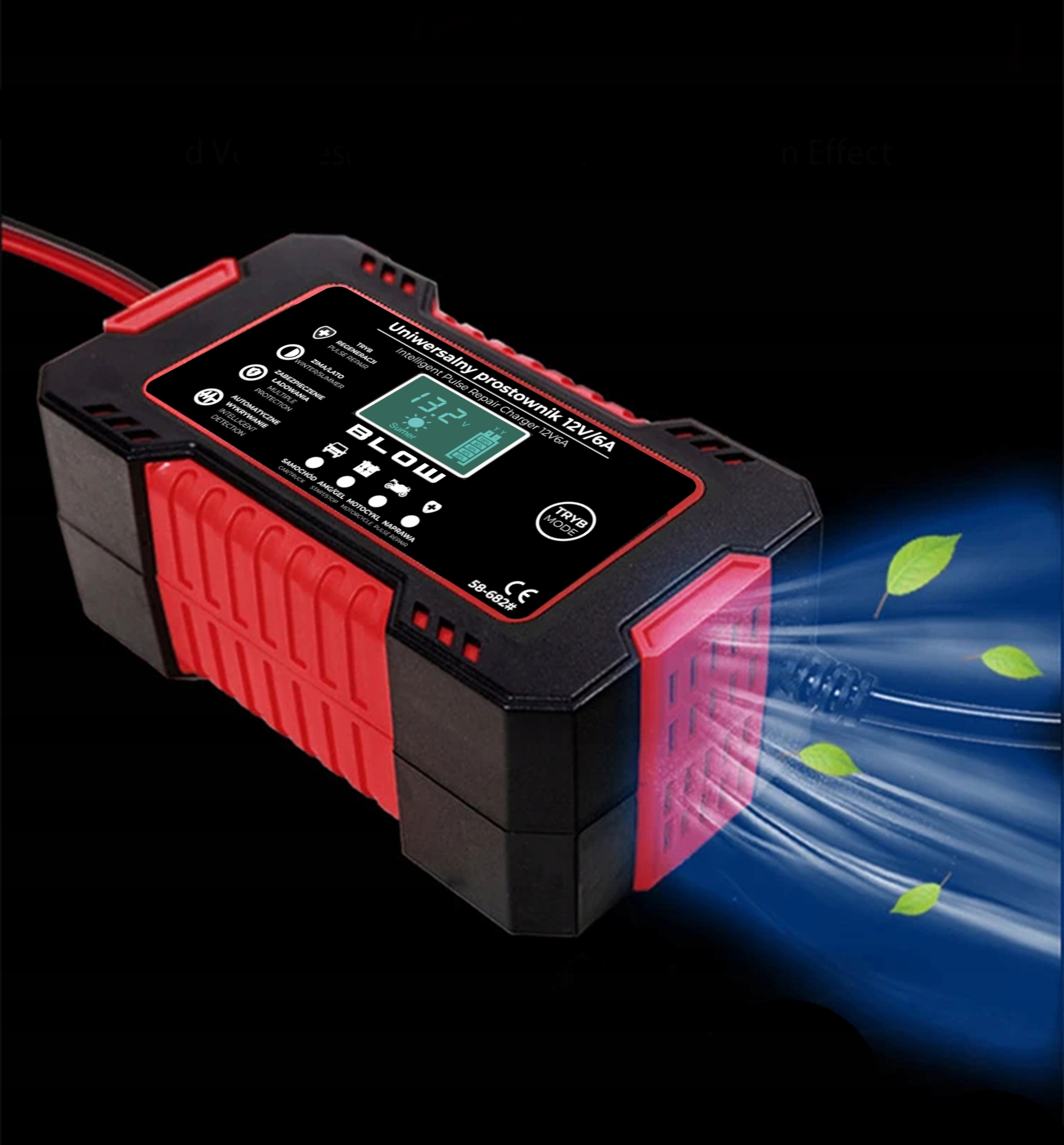 Prostownik został wyposażony w wentylator, który dba o prawidłową temperaturę pracy urządzenia oraz zapobiega przegrzaniu.