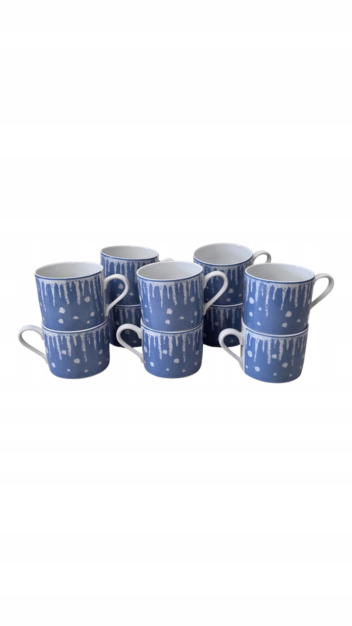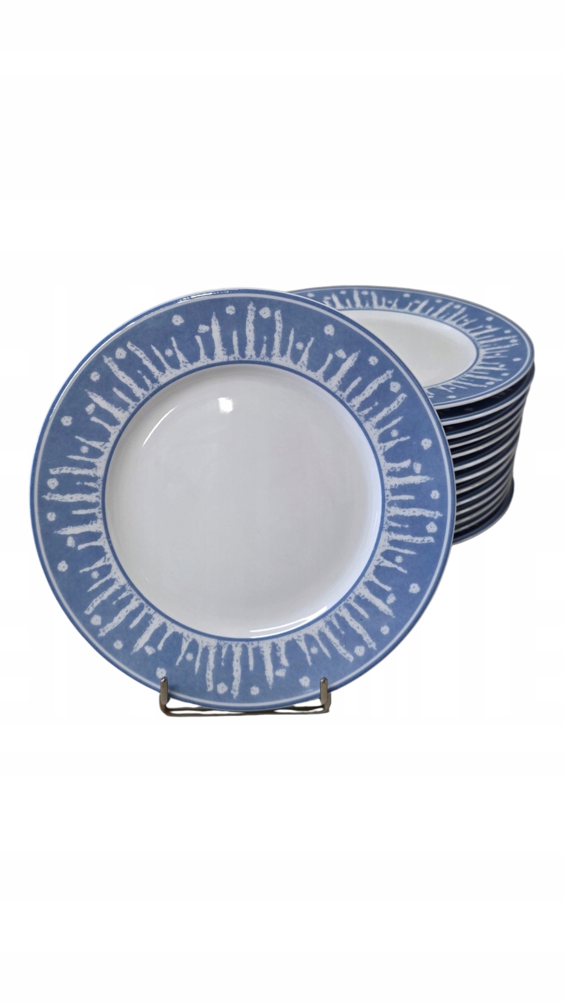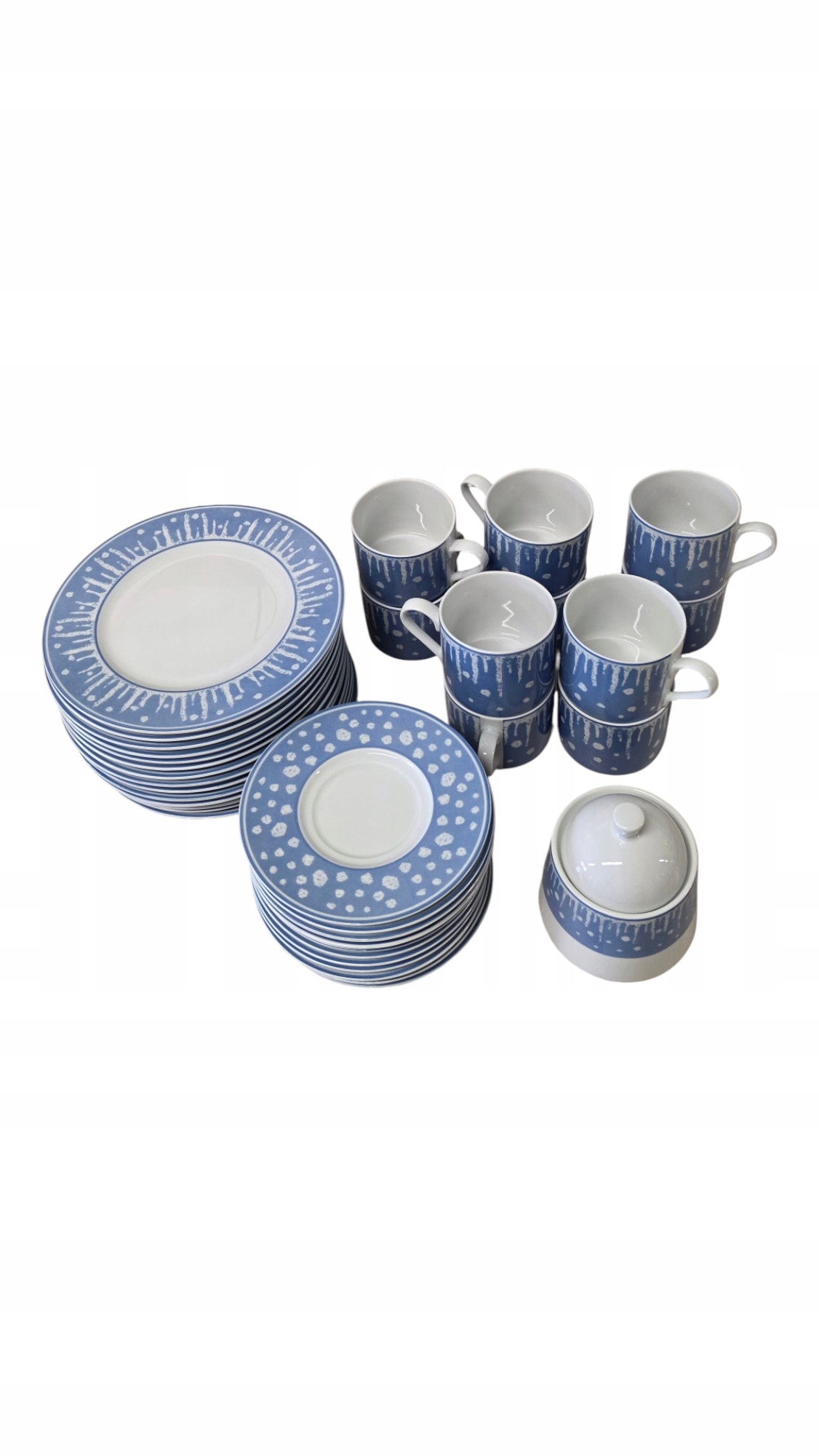 - 14 talerzy dużych (średnica 20 cm)- 11 talerzy małych (średnica 15 cm)- 10 filiżanek (wysokość ok 6 cm)- cukiernica (wysokość 11 cm)