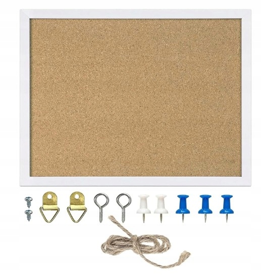 1 x biała tablica do przypinania (30 cm x 40), 2 x śruby, 2 x metalowe haczyki, 2 x śruby, 5 x gwoździe korkowe i lina. (Kolor losowy)