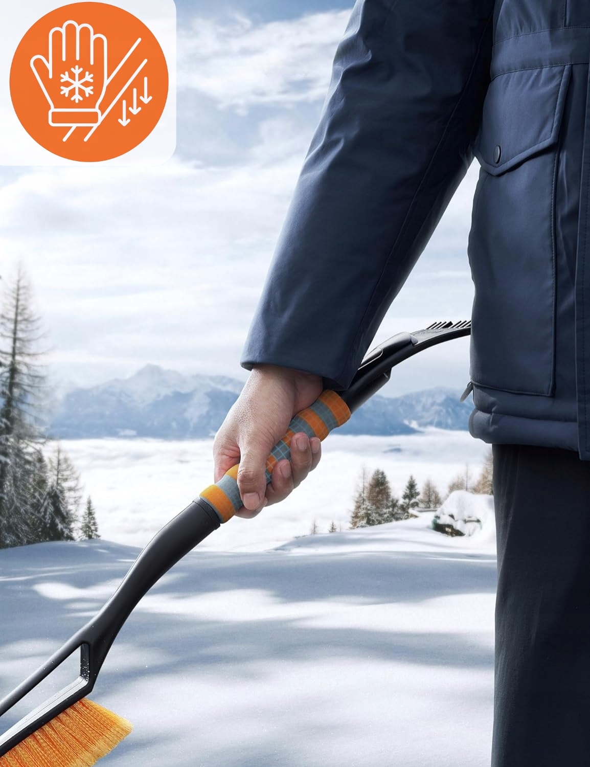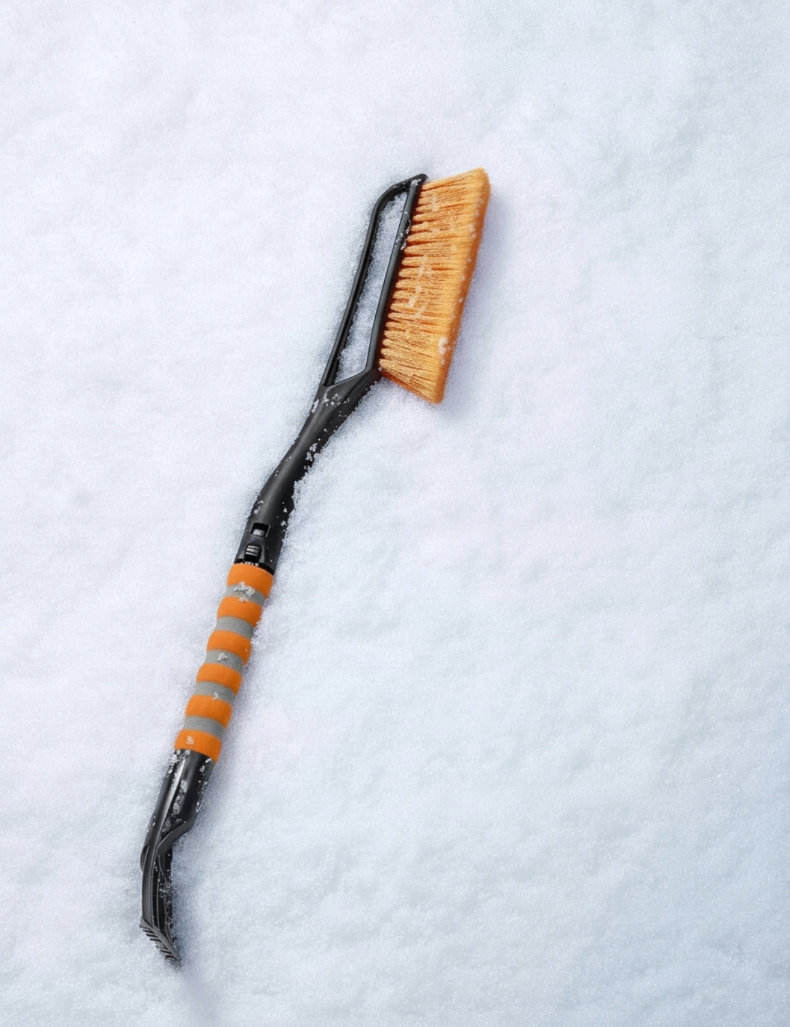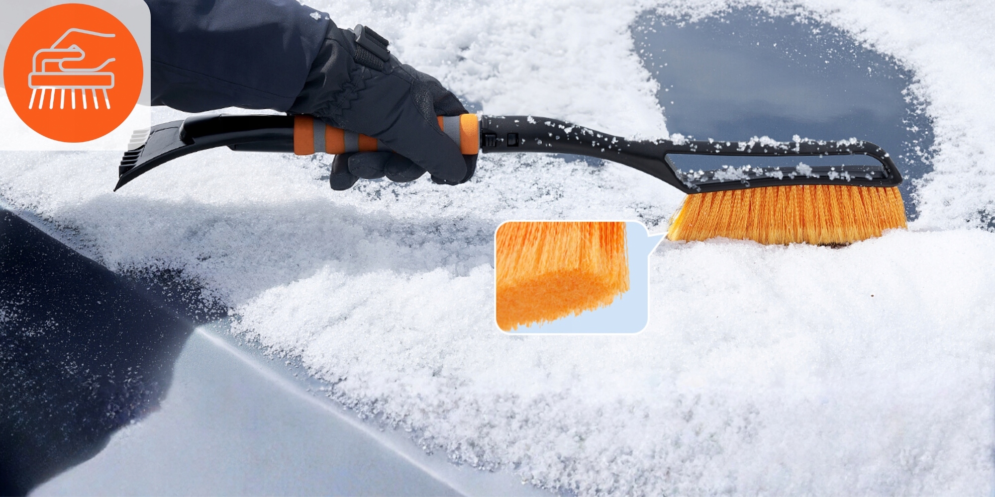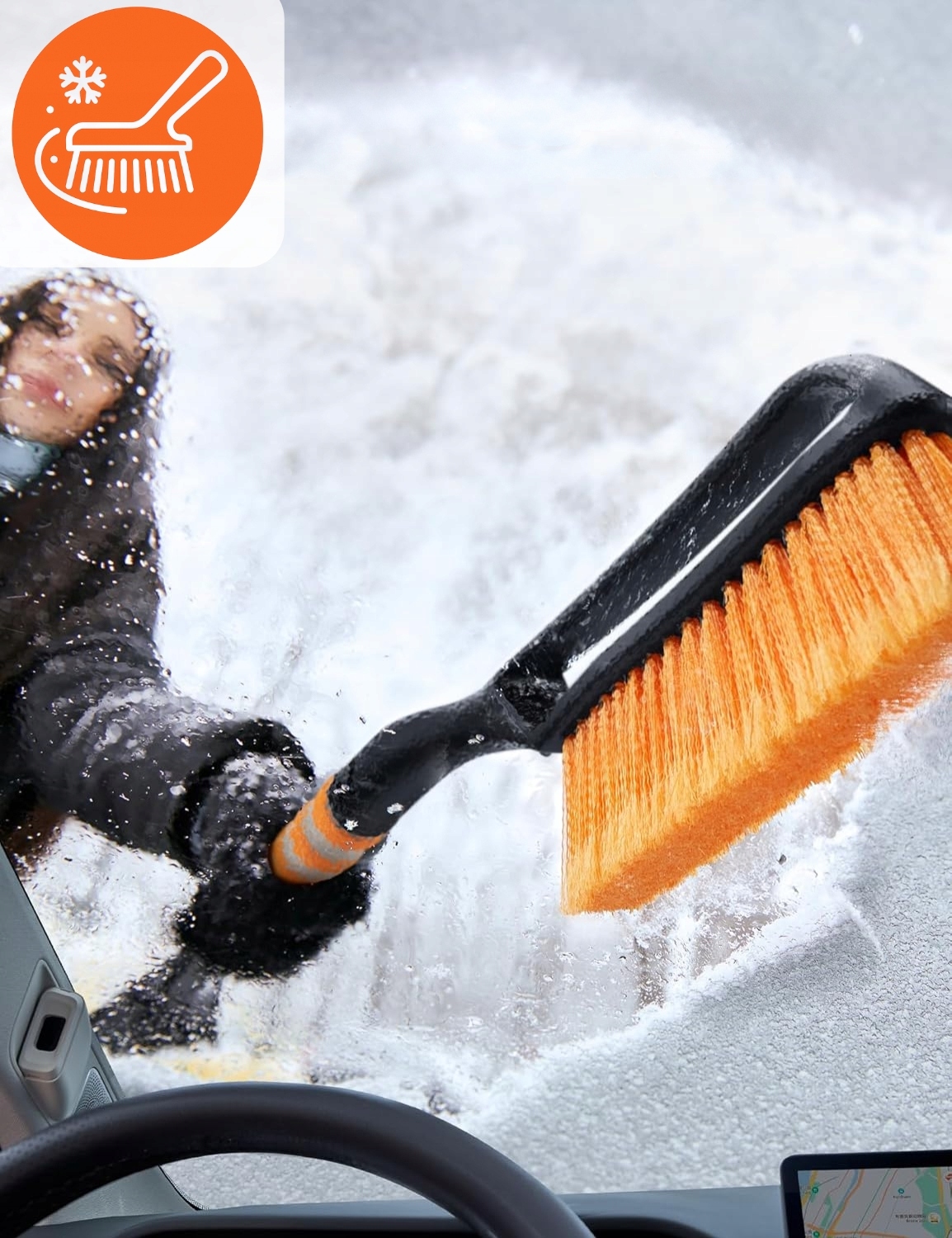 Miękkie, elastyczne włosie szczotki skutecznie usuwa śnieg i lód, jednocześnie nie rysując szyb ani lakieru.