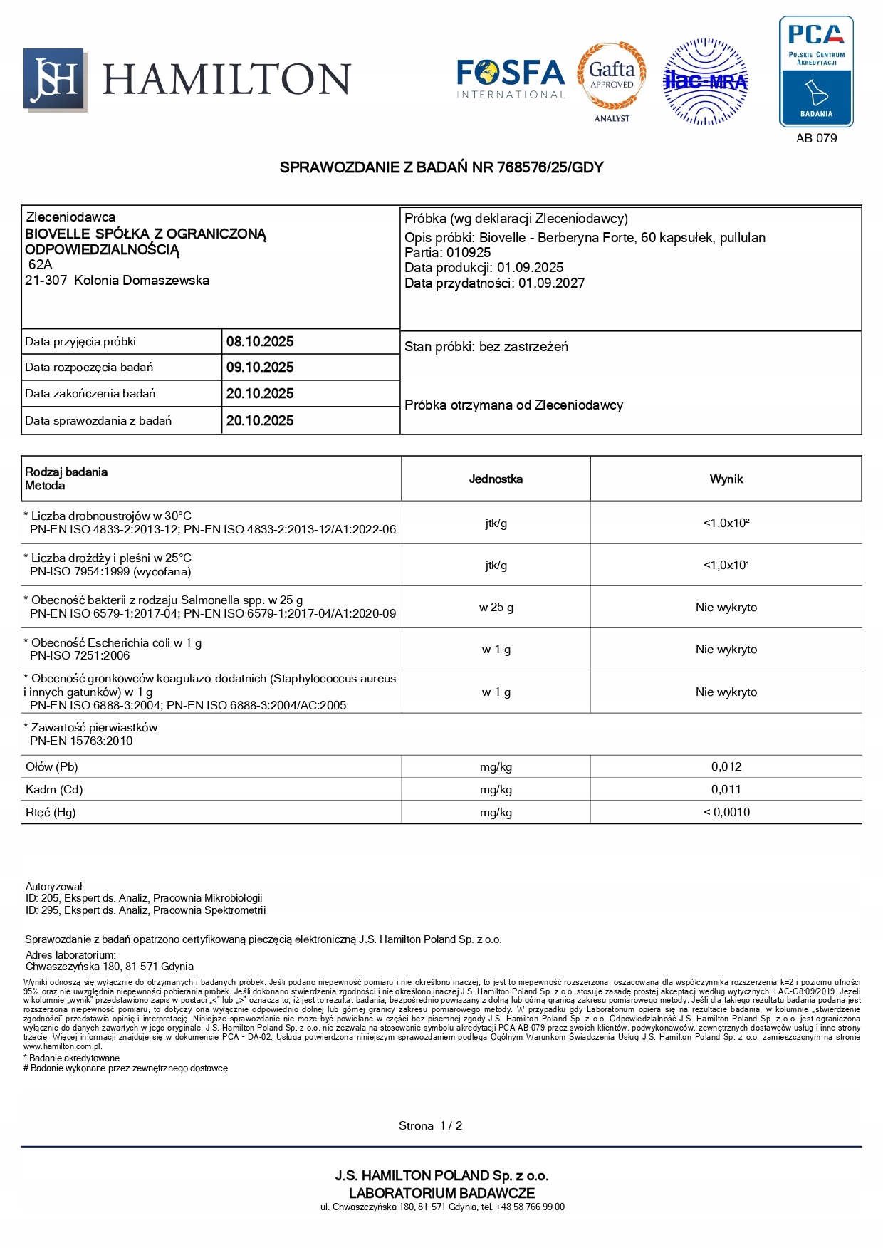 Każda partia produktów Biovelle jest badana w niezależnym laboratorium J.S. Hamilton pod kątem mikrobiologi oraz metali ciężkich — dla potwierdzenia najwyższej jakości naszych suplementów