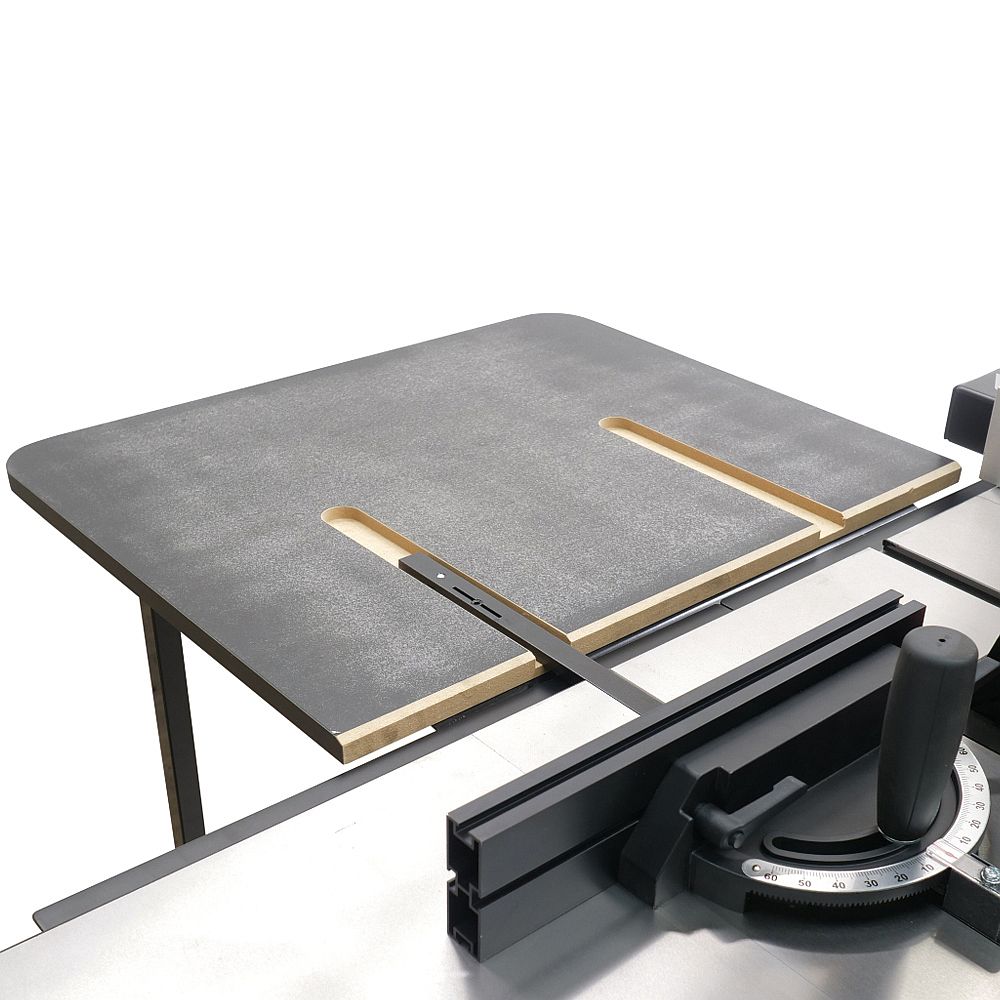 Na pierwszy rzut oka piła imponuje dużym żeliwnym stołem roboczym, który zapewnia wystarczający obszar do cięcia większych formatów. Piła posiada dodatkowe tylne przedłużenie stołu roboczego, które powiększa stół główny o 500 mm – taka powierzchnia robocza zapewnia dużo miejsca na wymiarowanie elementów wielkogabarytowych. Jednym z elementów wyposażenia pilarki jest masywna przykładnica wzdłużna z miękkim plastikowym uchwytem, którą można łatwo przesuwać po powierzchni pilarki i zablokować w dowolnej pozycji.