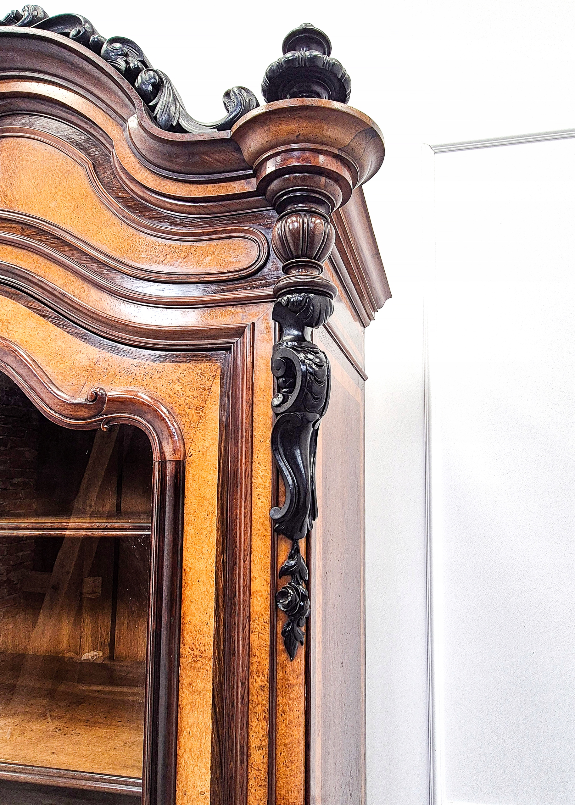 ➡️ Detale: rzeźbione pionowe zdobienia narożne, centralna snycerka na koronie, ozdobne okucia.