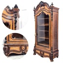 ➡️ Witryna wykonana z drewna brzozowego, z efektownymi wstawkami z czeczoty i dekoracyjnymi, rzeźbionymi elementami.