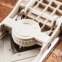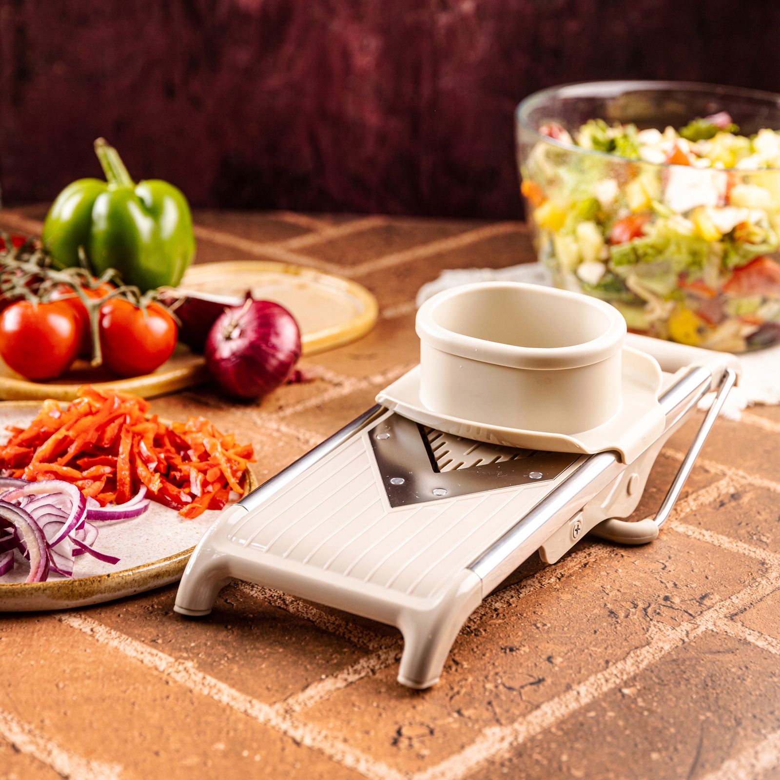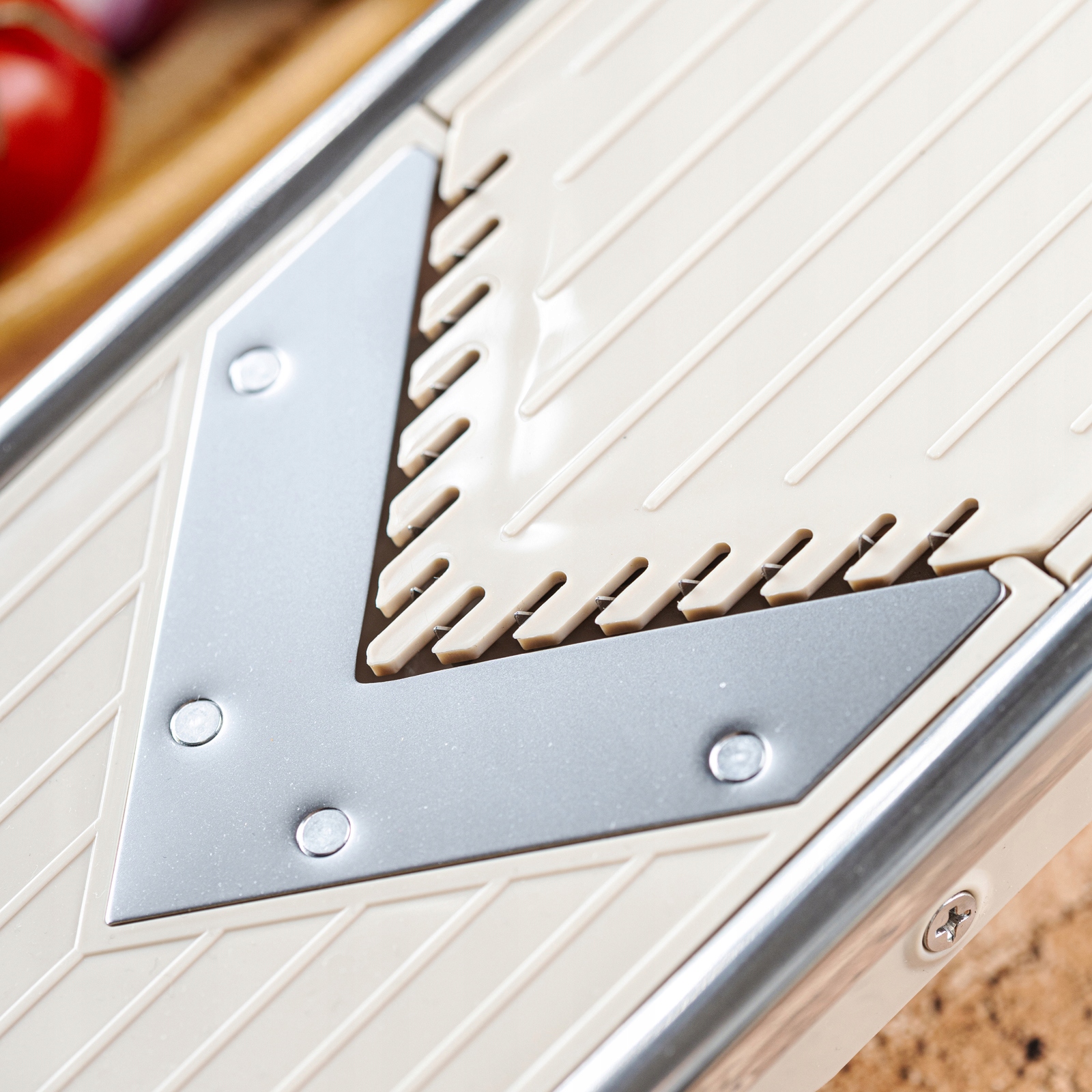 Mandolina ma płynny zakres regulacji – od bardzo cienkich płatków do grubszych talarków (dobierasz pokrętłem).