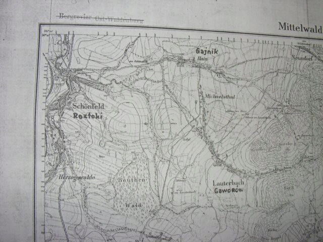 w skali 1:25 000 (1cm na mapie = 250m w terenie, bardzo dokładna, widoczne pojedyncze domostwa)