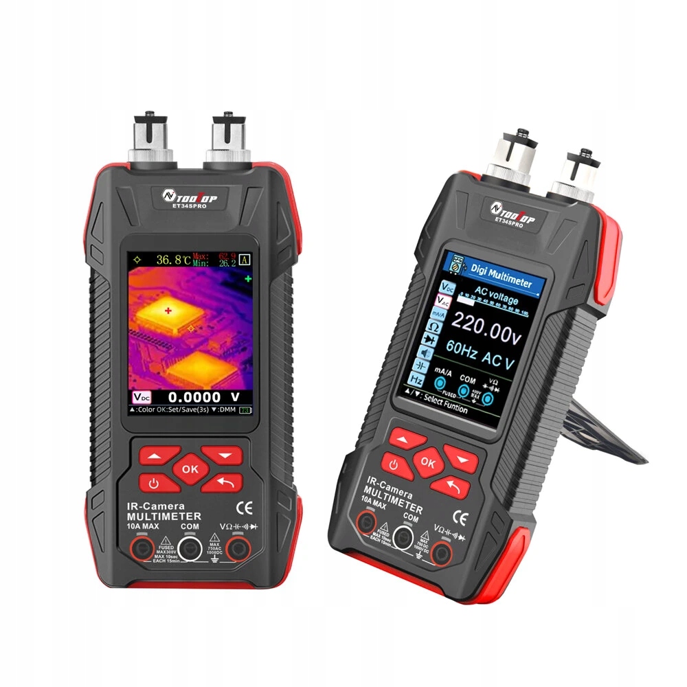 The ET34SPRO 2-in-1 thermal imaging multimeter with macro lens, red light pen, and power meter.