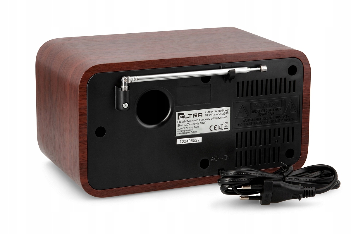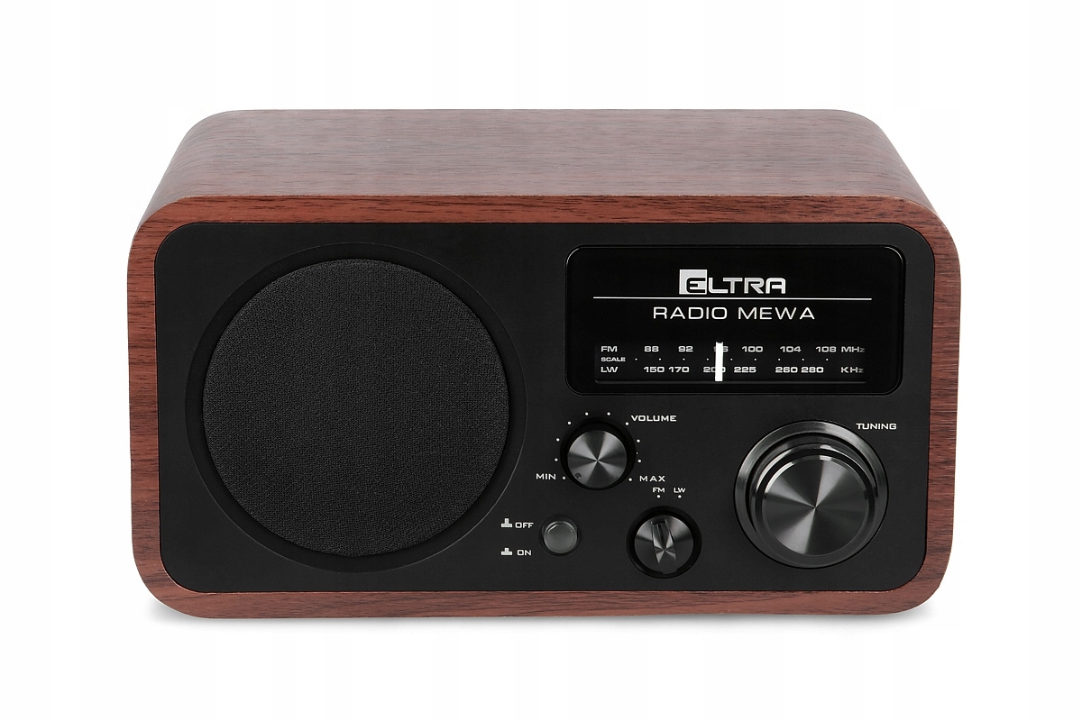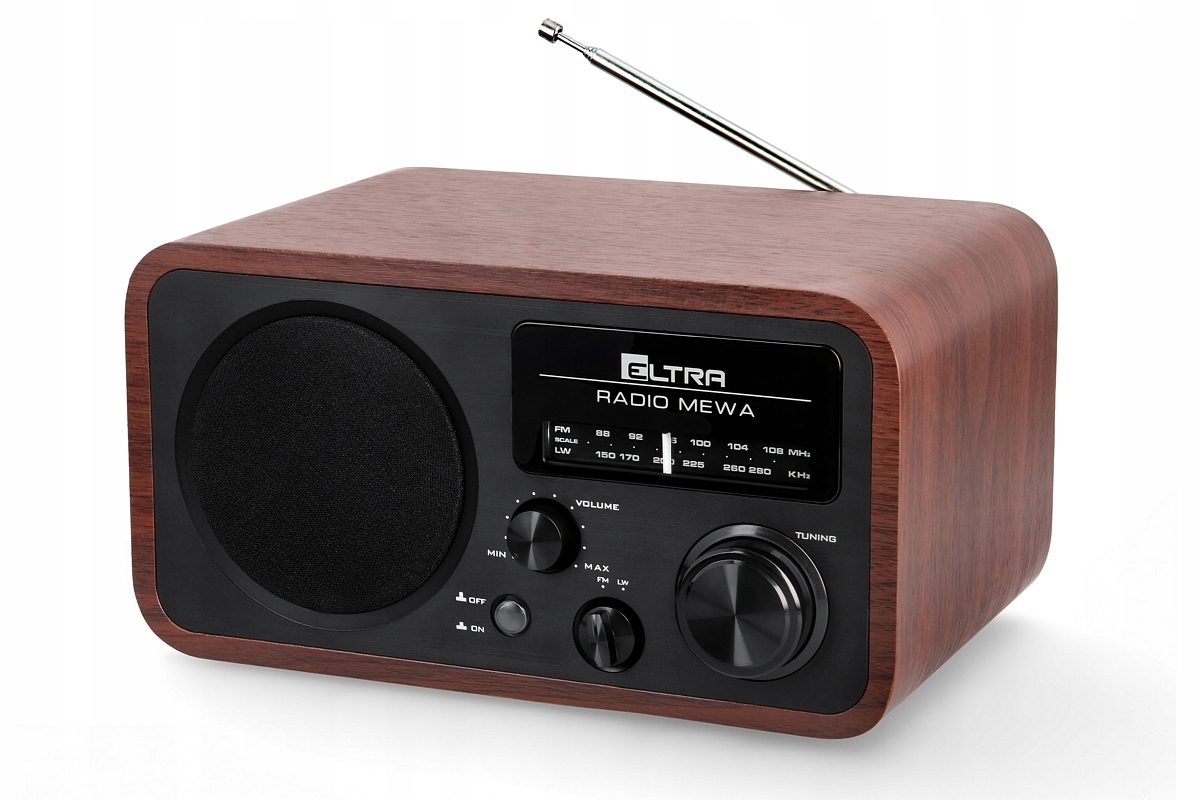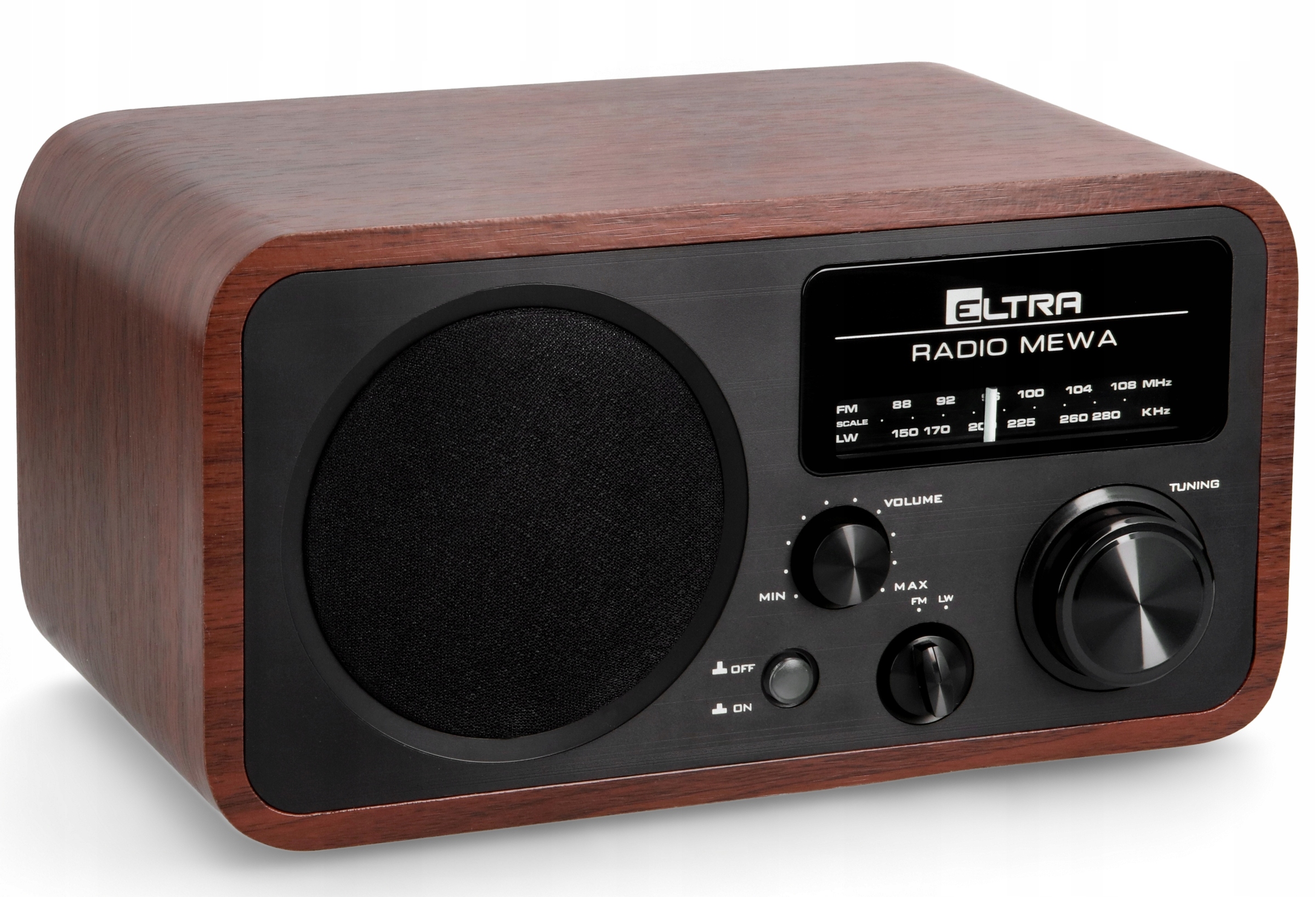 Funkcjonalny, prosty w obsłudze radioodbiornik stacjonarny w drewnianej obudowie, kolor dębu, przód kolor czarny.