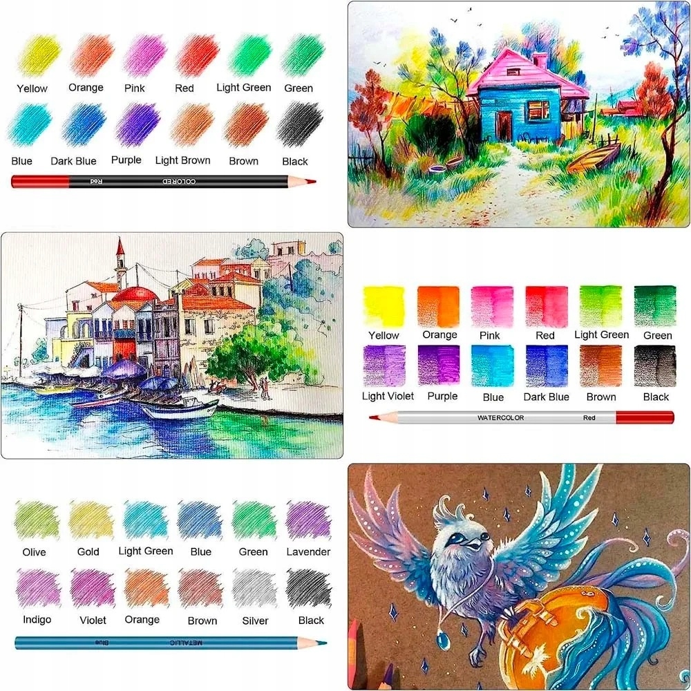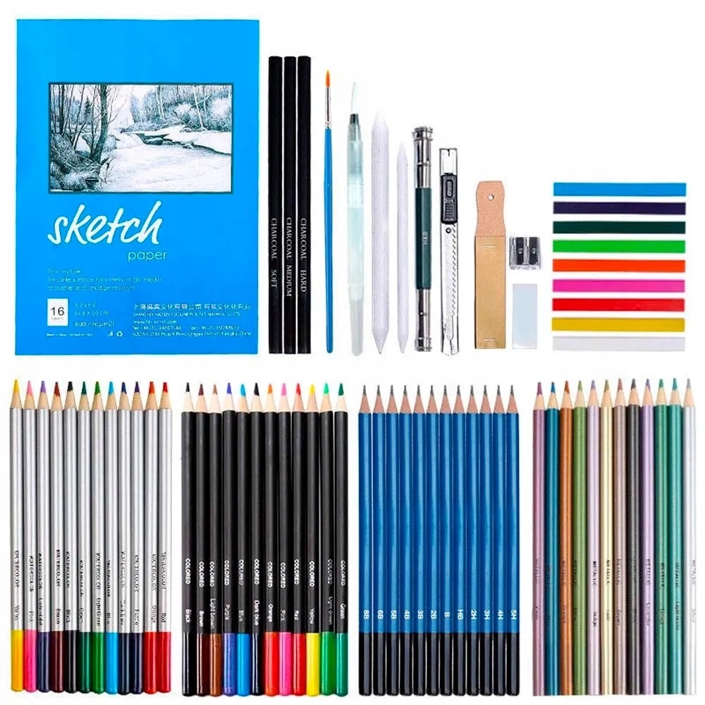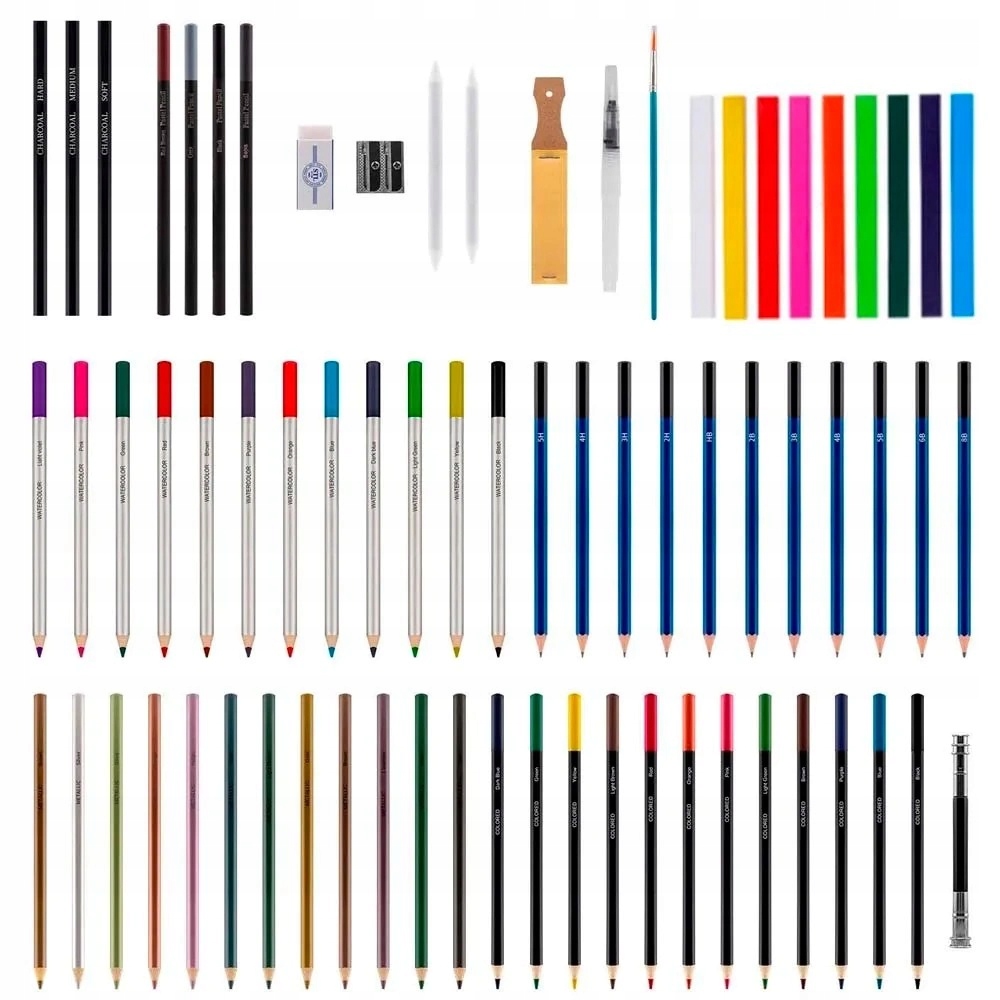 ✍️ Wszechstronny wybór narzędzi – ołówki grafitowe, kredki kolorowe, kredki akwarelowe, kredki metaliczne, węgle rysunkowe