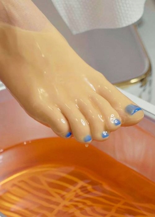 Profesjonalna parafiniarka utrzymuje idealną temperaturę zabiegu, dzięki czemu pielęgnacja jest nie tylko skuteczna, ale również niezwykle komfortowa. Miękkie skarpety frotte zatrzymują ciepło, wzmacniając działanie kosmetyku i potęgując odczucie głębokiego relaksu.