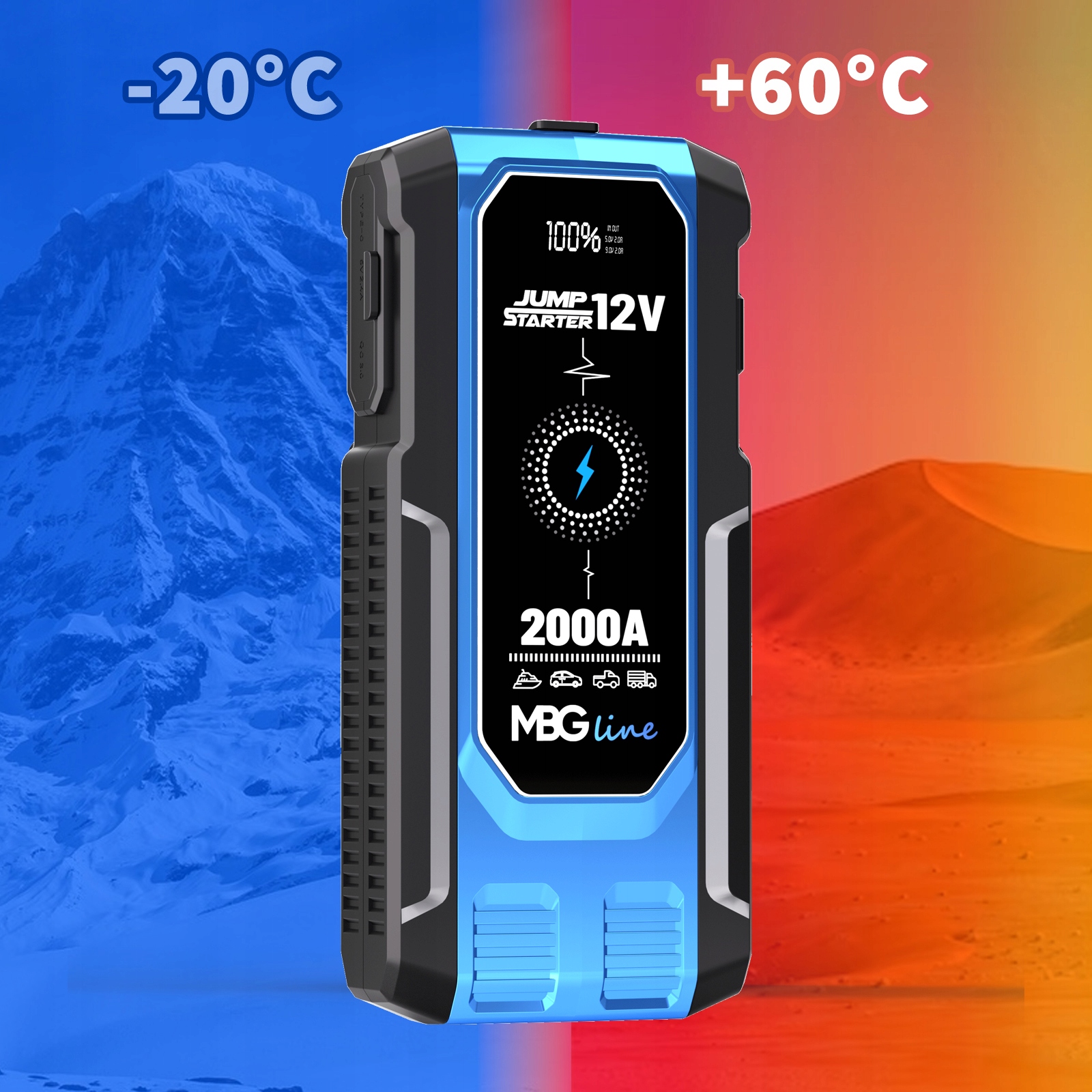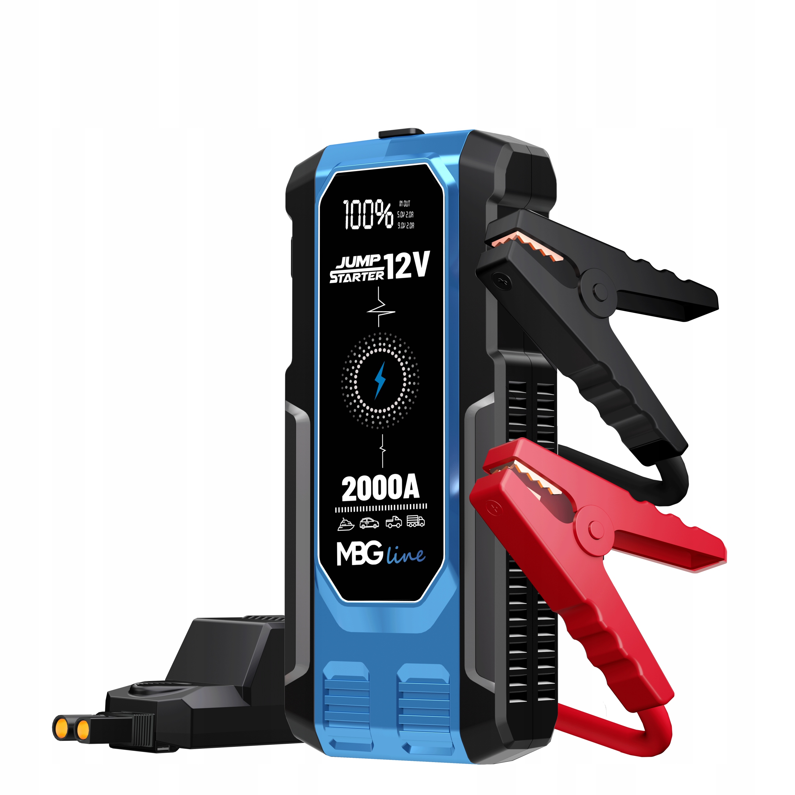 Jump Starter MBG line ET23 to nie tylko przenośna bateria, ale także urządzenie gotowe do uruchomienia Twojego samochodu w przypadku awarii. Posiada zasilanie wyjść EC5 o napięciu 12V i potężnym prądzie rozruchowym wynoszącym 800A, z maksymalnym prądem 2000A, co sprawia, że jest w stanie uruchomić silniki benzynowe o pojemności poniżej 7,0 l (7000 cm3) oraz silniki wysokoprężne o pojemności poniżej 5,0 l (5000 cm3).