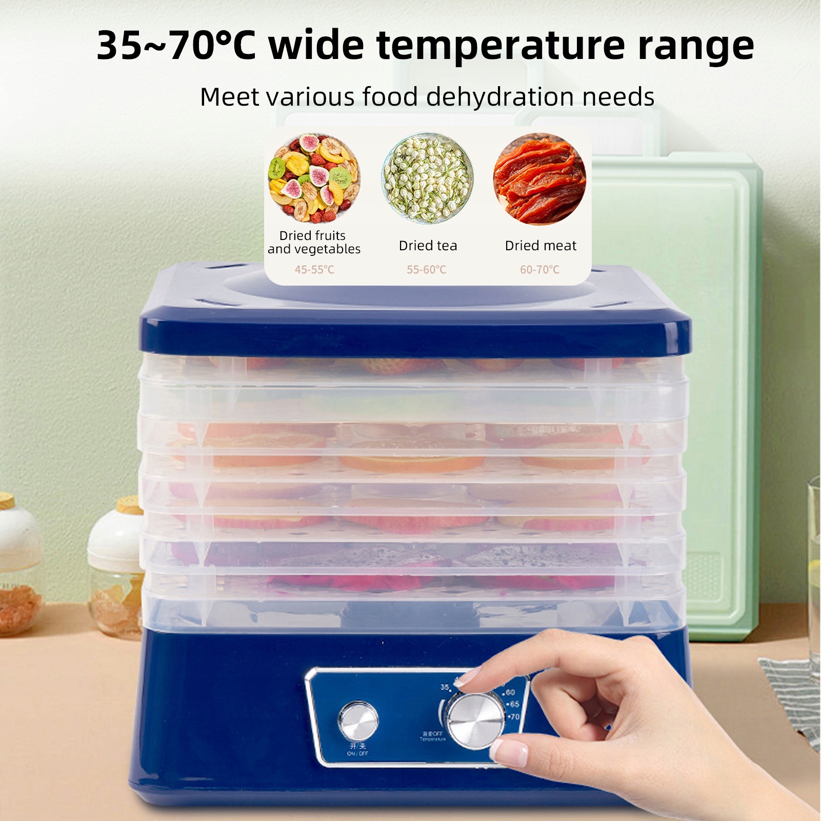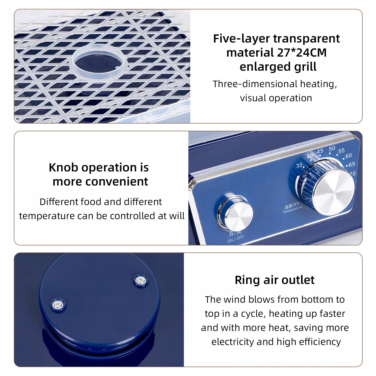 3. 【Duża pojemność】 Suszarka do żywności z 5-poziomowymi dużymi stojakami do suszenia o wymiarach 27*24 cm/10,63*9,45 cala. Można suszyć różne produkty spożywcze jednocześnie: owoce, suszone mięso, warzywa, pachnącą herbatę itp.