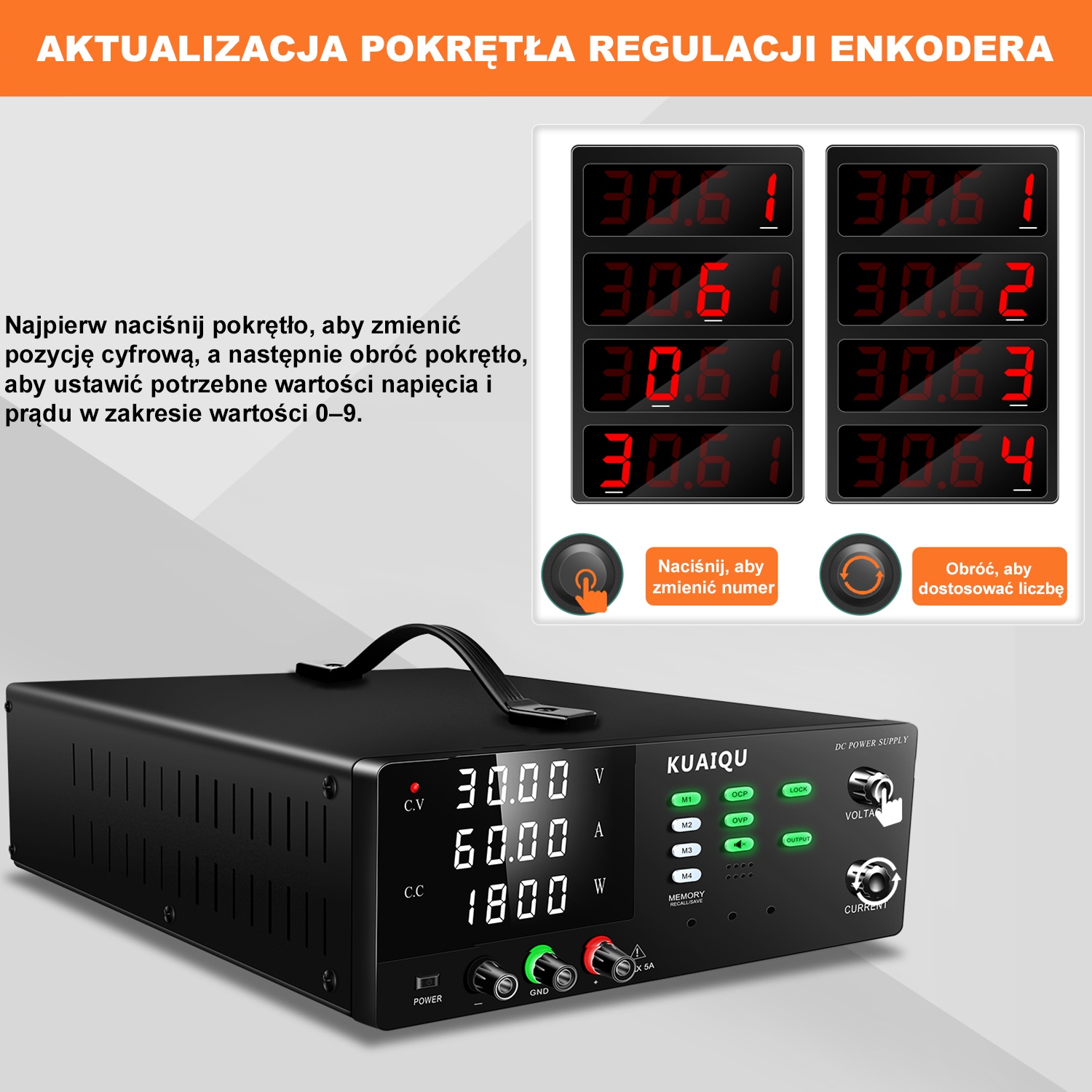 Pokrętło enkodera pozwala na szybką i precyzyjną regulację napięcia i prądu, z dokładnością odpowiednio do 0.01 V i 0.001 A. Dodatkowo, nowa, przemyślana funkcja – przycisk blokady panelu – zapobiega przypadkowemu naciśnięciu przycisku podczas użytkowania, zapobiegając ponownej regulacji oraz zwiększając bezpieczeństwo i efektywność.
