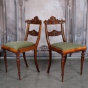 Ciekawe krzesła do jadalni lub stolika kawowego. Krzesła posiadają charakterystyczne, rzeźbione oparcia, z misternymi, rzeźbionymi motywami liści i muszli u góry i na środkowej poprzeczce, przednie nogi są toczone i zwężają się ku dołowi, podczas gdy tylne nogi są wygięte (tzw. "sabre legs", nogi szablaste). Siedziska typu "drop-in" (łatwe do wyjęcia w celu tapicerowania), obite tkaniną (w tym przypadku jasnozielony welur).