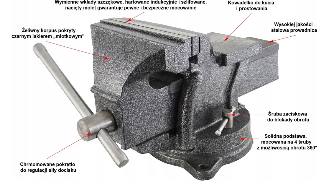 ✔️ Estetyczne i trwałe wykończenie – lakier młotkowy nie tylko chroni, ale również nadaje imadłu profesjonalny wygląd.