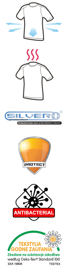 Produkt stanowi połączenie funkcjonalności z modnym nadrukiem. Wzór naniesiony metodą sublimacji gazowej jest niewyczuwalny, niespieralny i nie wpływa w żaden sposób na walory użytkowe. Specjalny, mikrokanałowy poliester wzbogacony o apreturę jonów srebra Ag+ zapewnia doskonałą wentylację i zapobiega powstawaniu nieprzyjemnych zapachów.