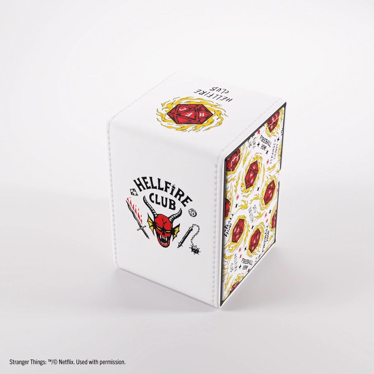 Ta wieża 2 w 1 służy również jako wysokiej jakości miejsce do przechowywania kostek. Silne magnesy zapewniają kompatybilność z Hellfire Club Master Screen, podczas gdy zdejmowana pokrywa zamienia się w ogranicznik dla kostek. Wieża idealnie nadaje się również do większych kostek do 25 mm, na przykład Hellfire Club Premium Metal D20, i wygodnie mieści się w większości standardowych deck boxów.