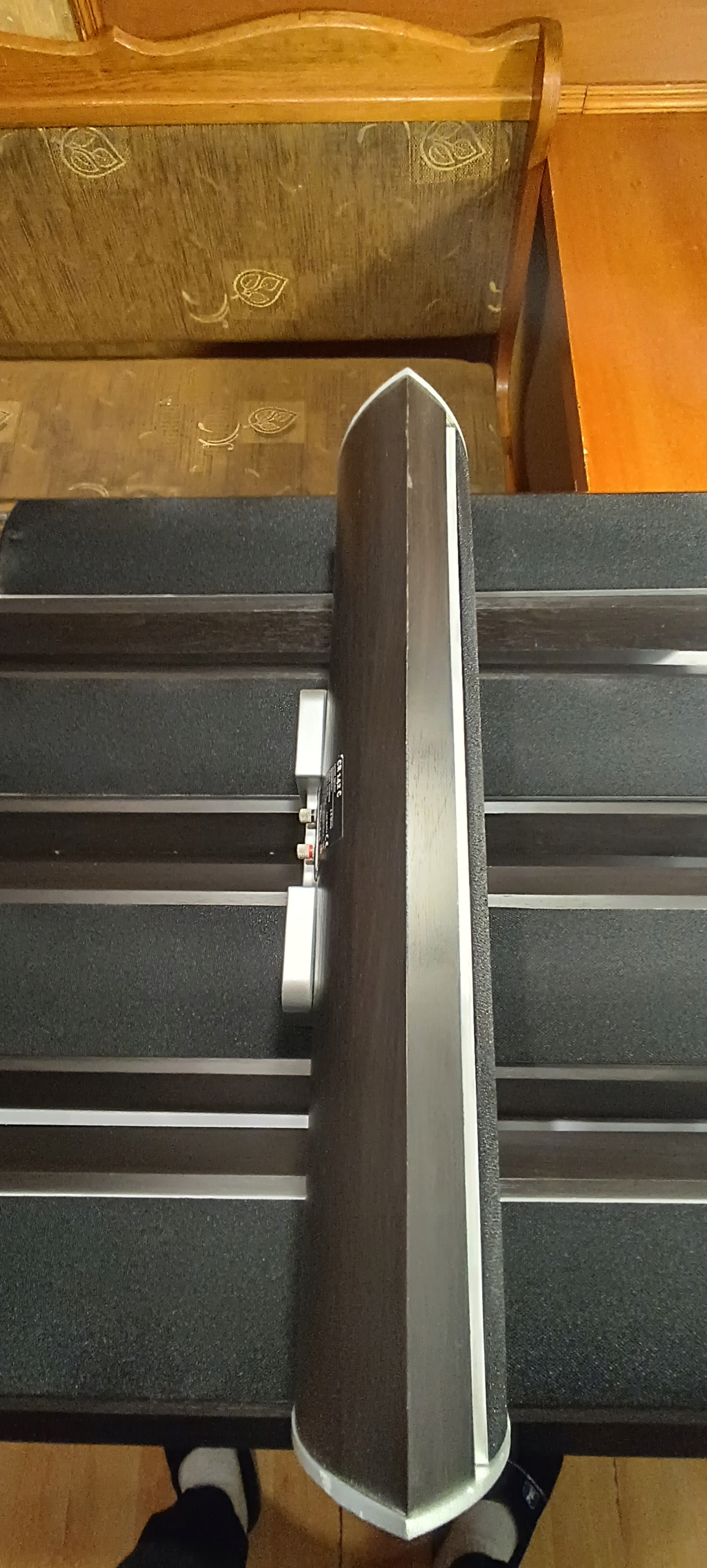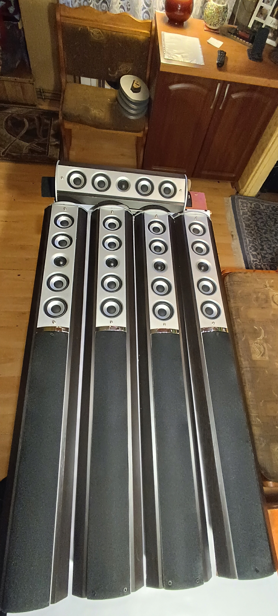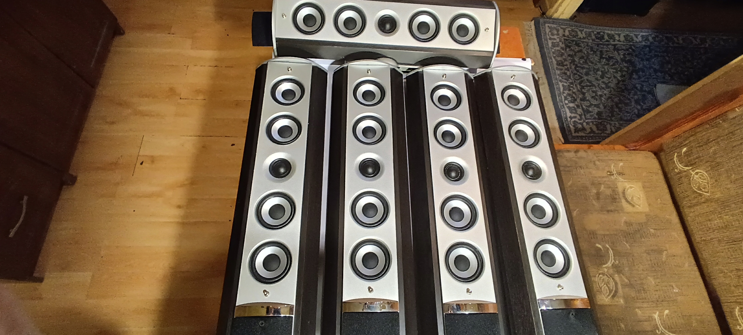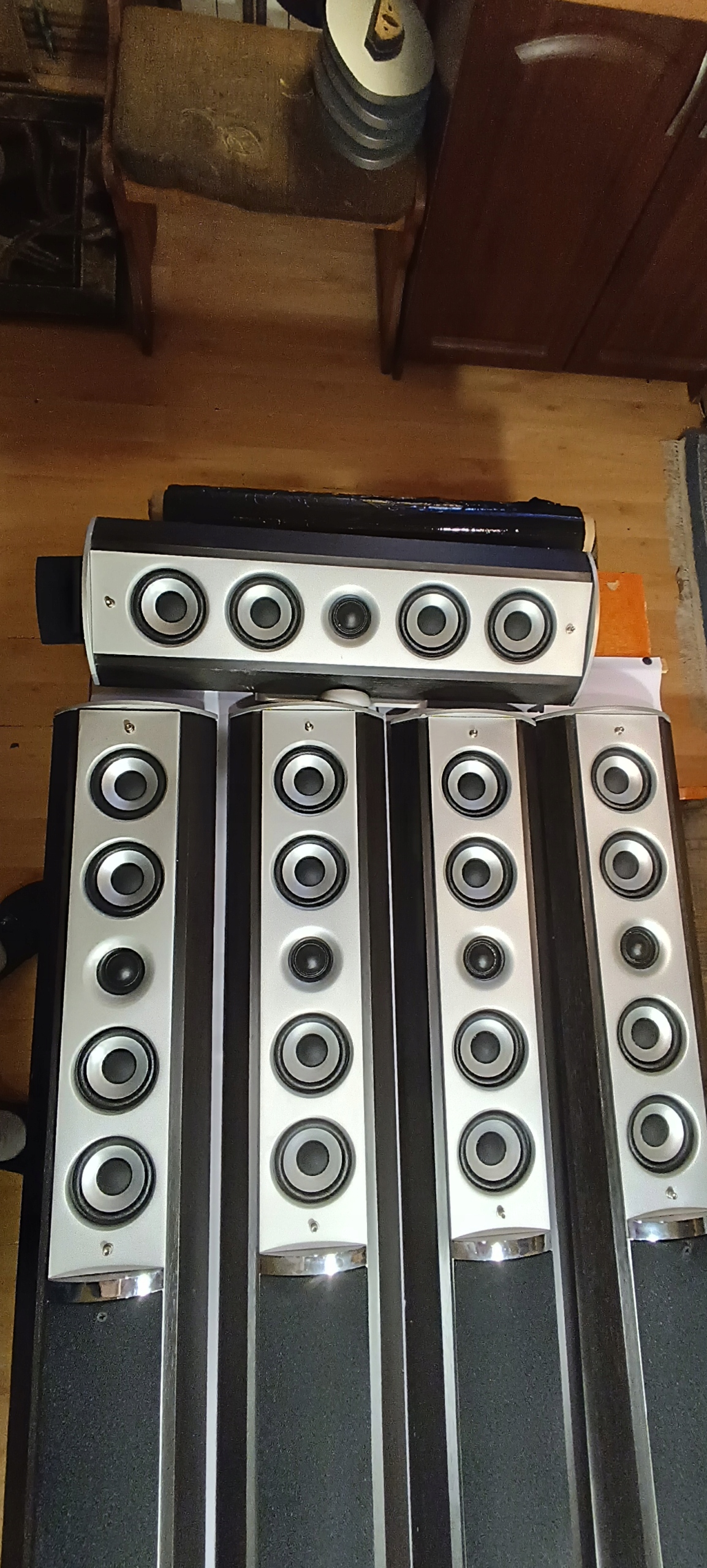 Stan wizualny jak na zdjęciach. Obudowy w większości całe. Na dole dwóch kolumn centralnych rozchodzi się drewno. Na jednej kolumnie frontowej z tyłu nad terminalem podłączeniowym pęknięte drewno w kształcie litery (T) na długość 10 cm. Poza tym cztery podstawy od kolumn są oderwane, oraz jeden terminal do podłączenia kabla jest wgnieciony do środka i ma ułamaną śrubę do podłączenia kabla.