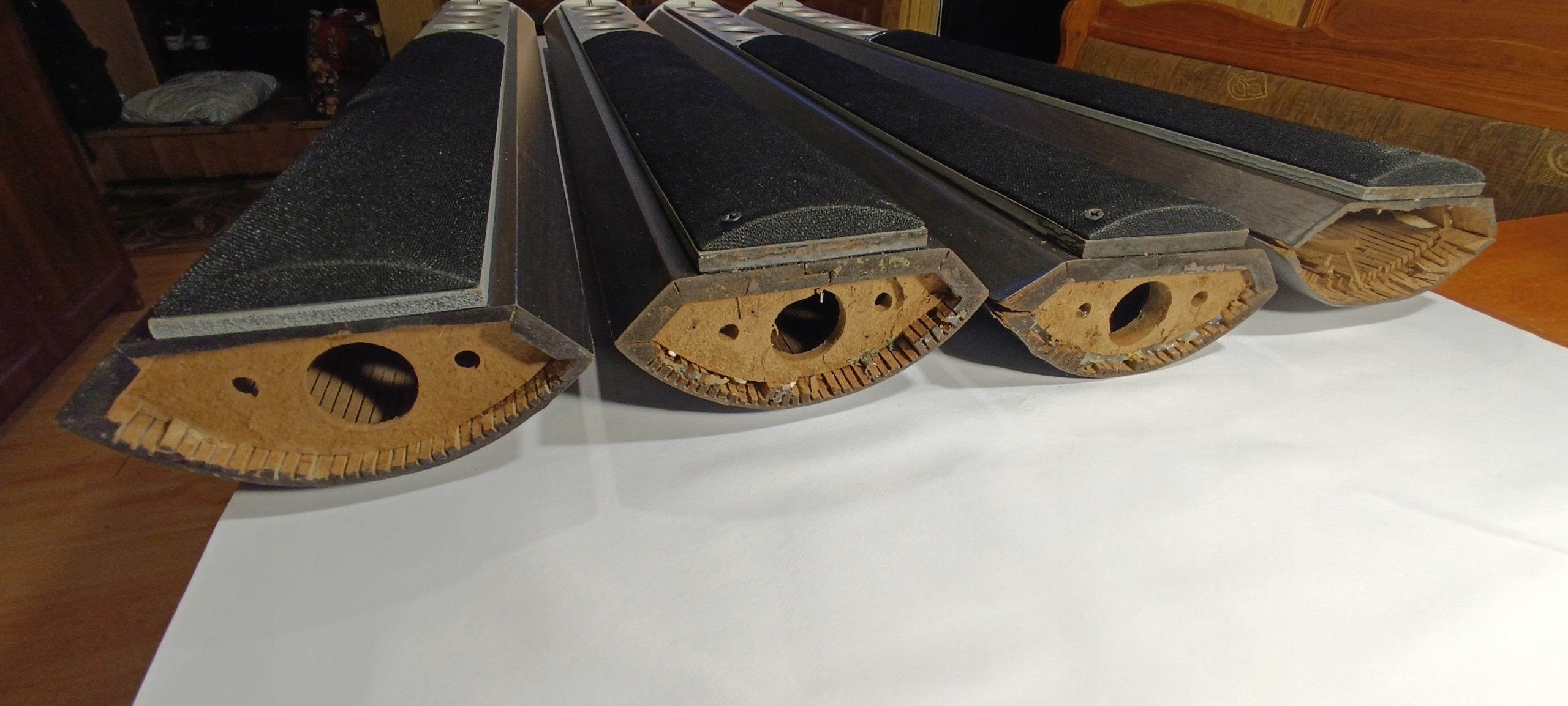 Z uwagi na wyżej wymienione uszkodzenia obudów i oderwane podstawy kolumny sprzedaję tanio jako uszkodzone, do naprawy i renowacji. Można spróbować połączyć jakoś podstawy z kolumnami lub zamontować uchwyty do powieszenia na ścianie. Zostawiam to kupującemu.