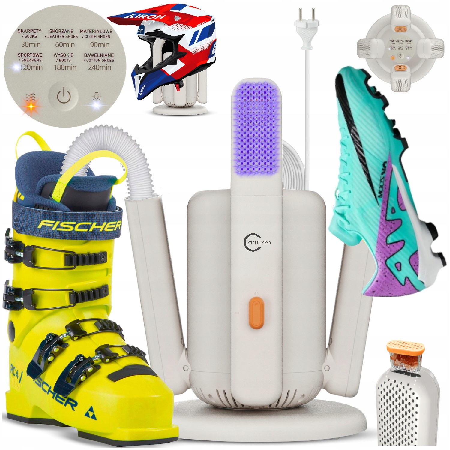 ► Suszarka bardzo szybko i bezpiecznie wysuszy i przeprowadzi dezynfekcje wszelkiego rodzaju: obuwia, skarpet, rękawic, kasków motocyklowych itp. eliminując wszelkie zapachy pleśnie i grzyby.