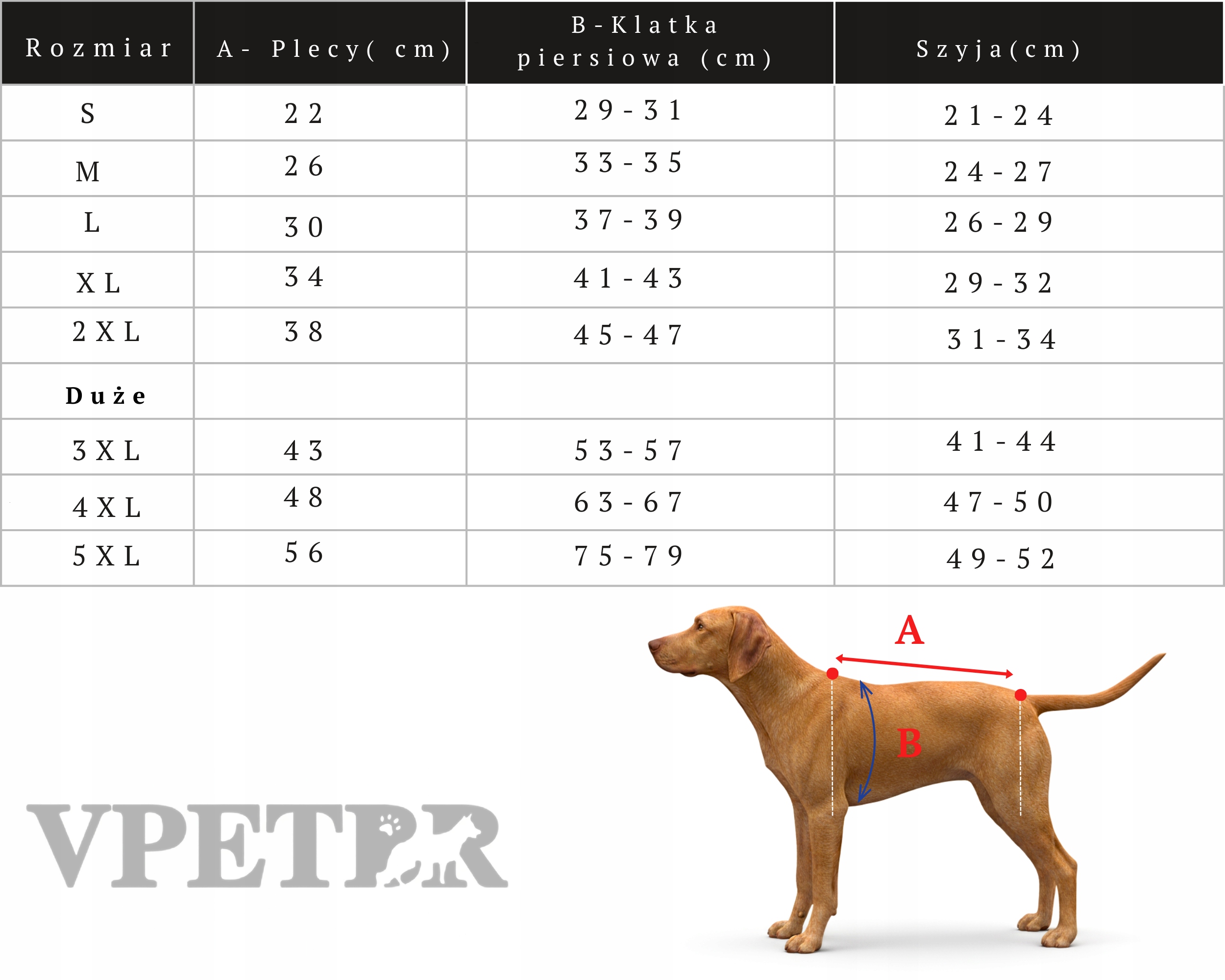 Jeśli długość grzbietu Twojego psa jest większa niż ta podana w tabeli rozmiarów, użyj jako punktu odniesienia pomiaru obwodu klatki piersiowej.