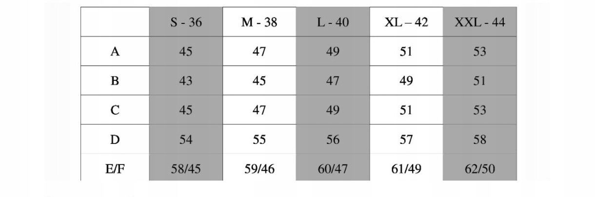 E/F - Długość rękawa po zewnętrznej/od pachy