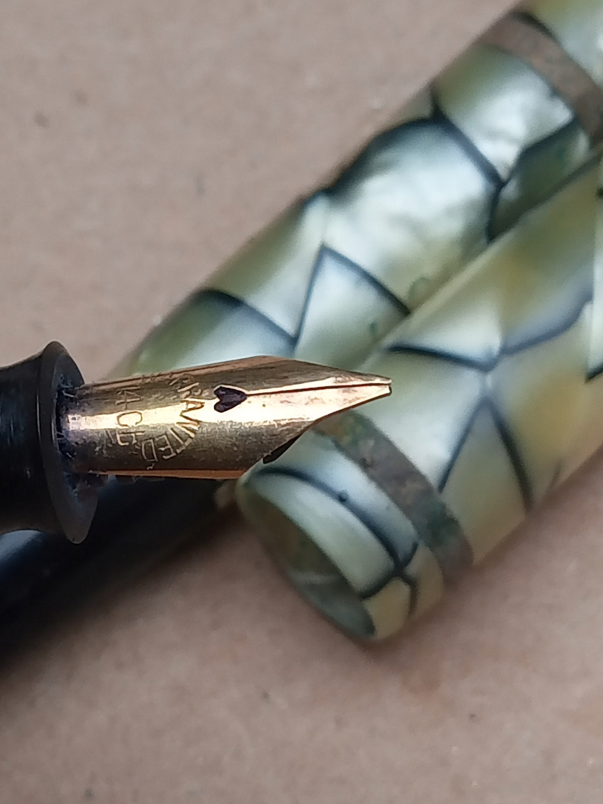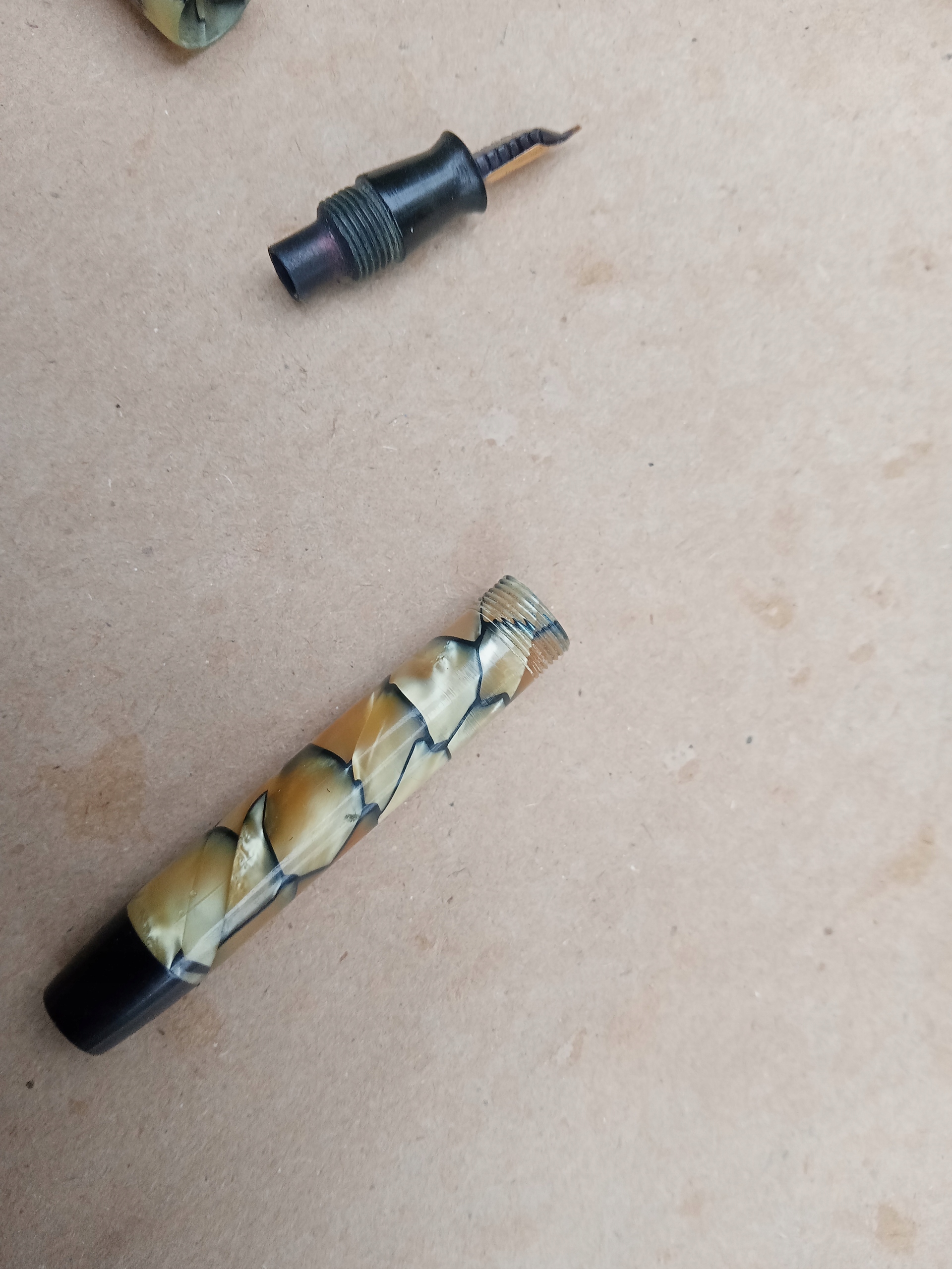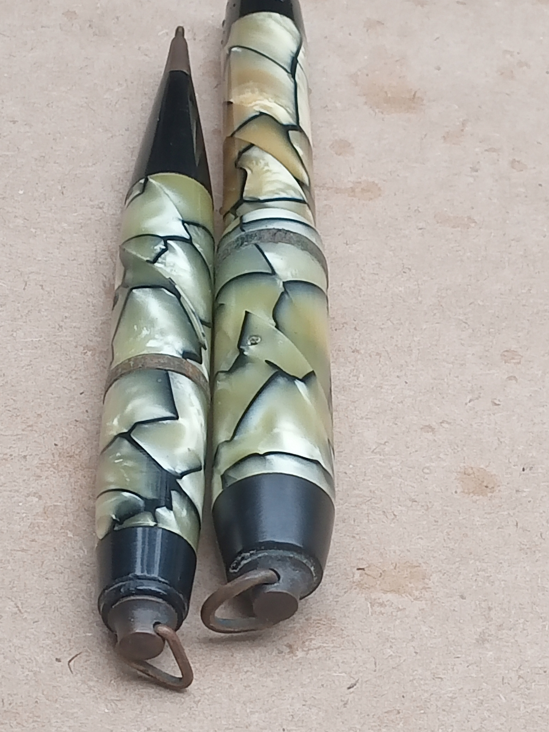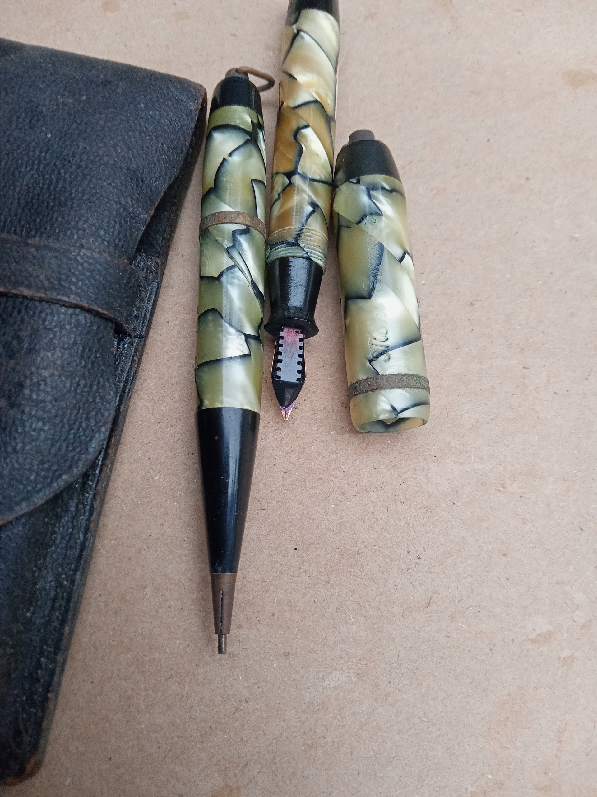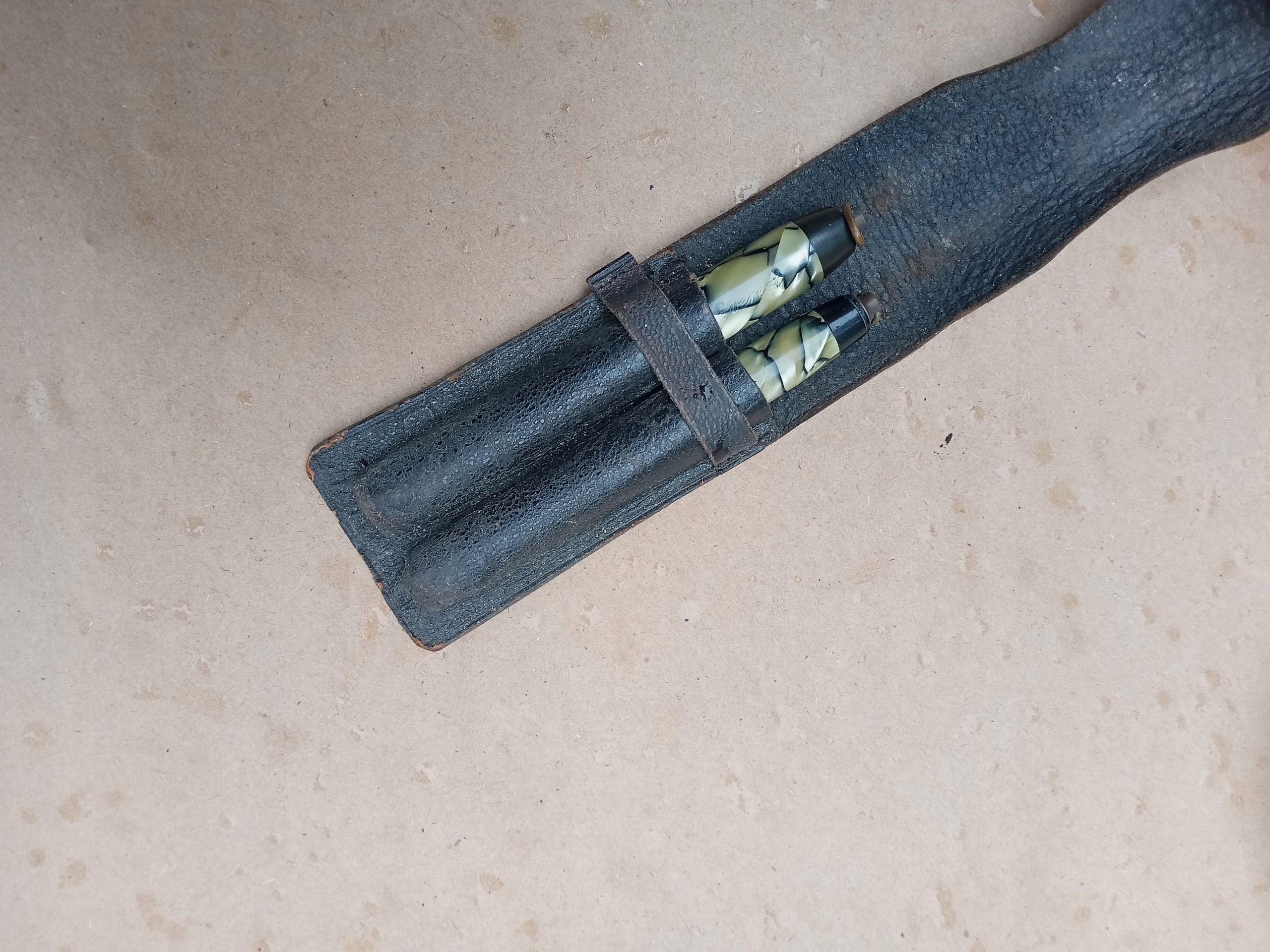 skórzany pokrowiec ma oderwany pasek z jednej strony , na pokrowcu , na ołówku i piórze napisy MONT EVEREST , długość pióra 9 cm , długość ołówka 9 cm , na stalówce napis WARRANTED 14 Cb