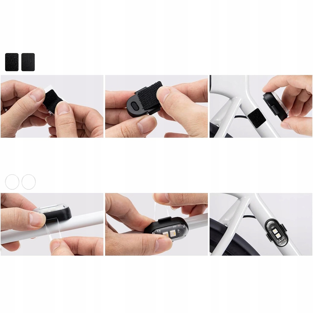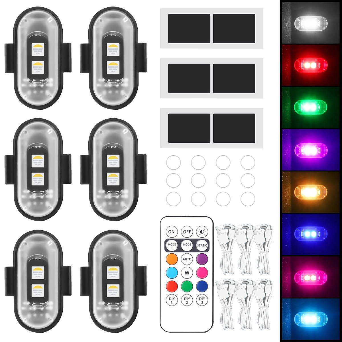 6 lamp stroboskopowych LED, 1 pilot zdalnego sterowania, 12 gumowych pierścieni, 6 naklejek z rzepem, 6 kabli USB do ładowania i 1 instrukcja obsługi.