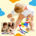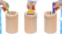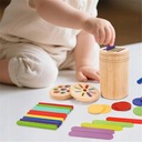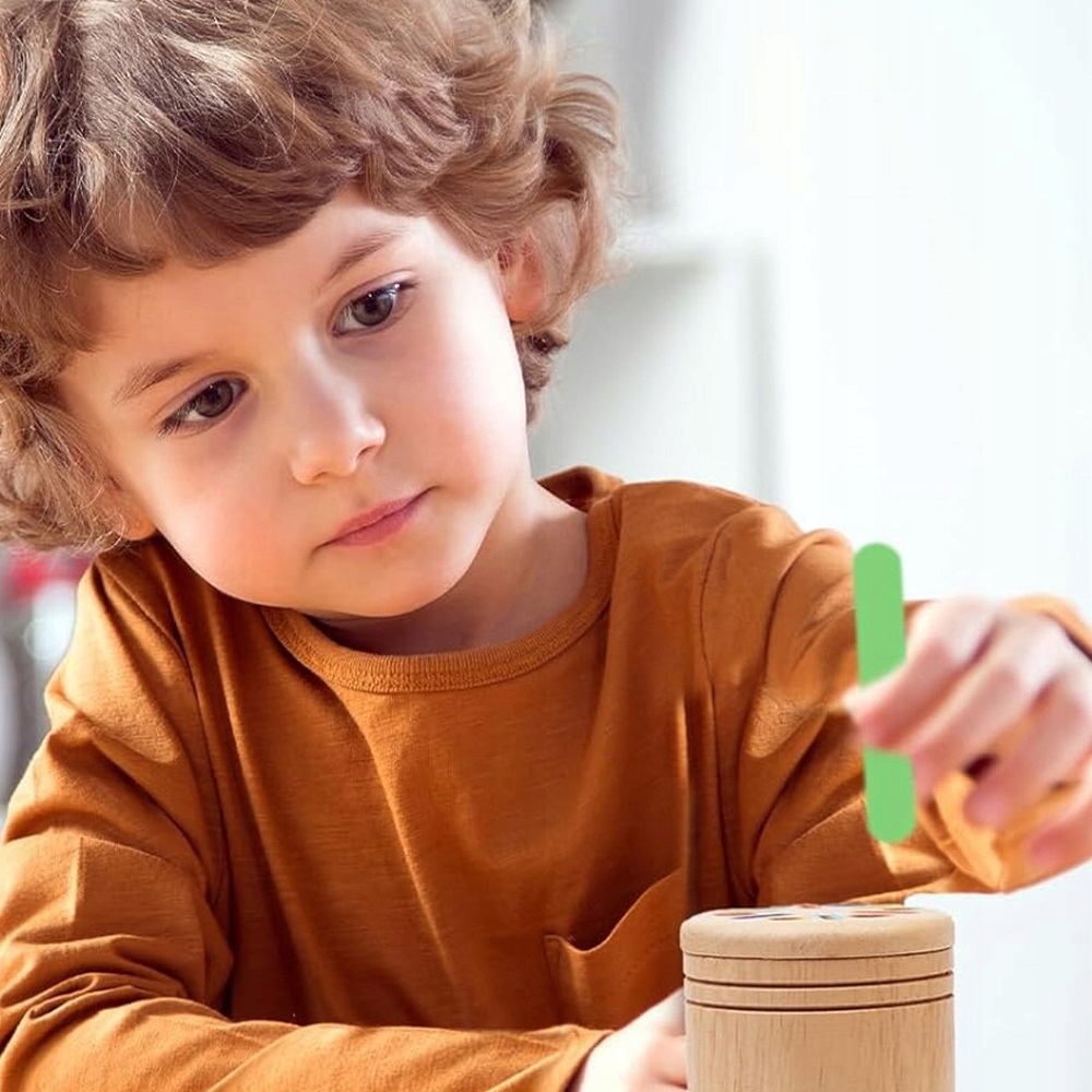 Maluchy fascynuje wkładanie kolorowych, drewnianych patyczków w otwory, co pomaga rozwijać małą motorykę i rozpoznawanie kolorów.