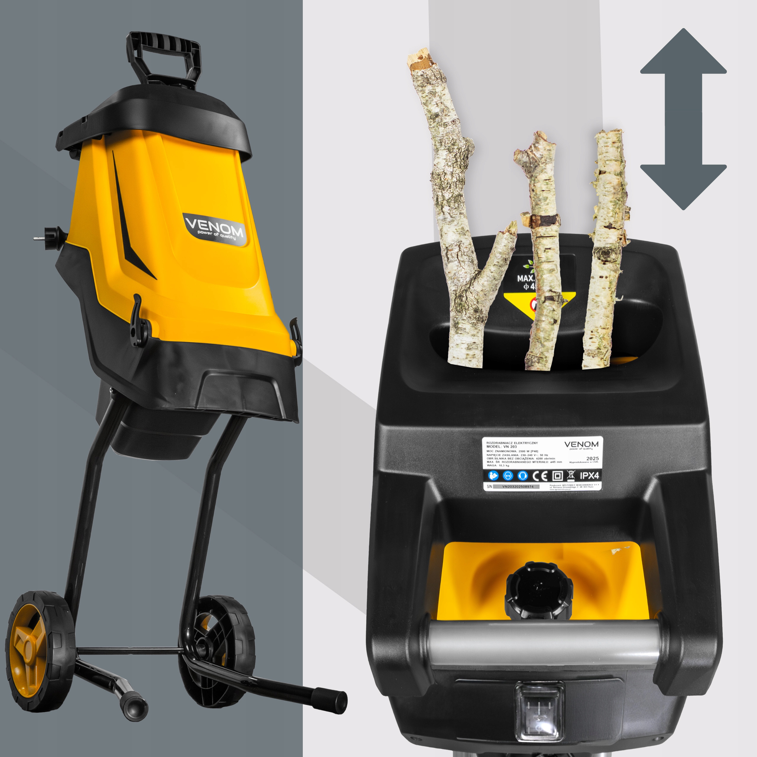 MOCNY ROZDRABNIACZ ELEKTRYCZNY RĘBAK DO GAŁĘZI 45MM SILNIK ZBIORNIK 45L PRO