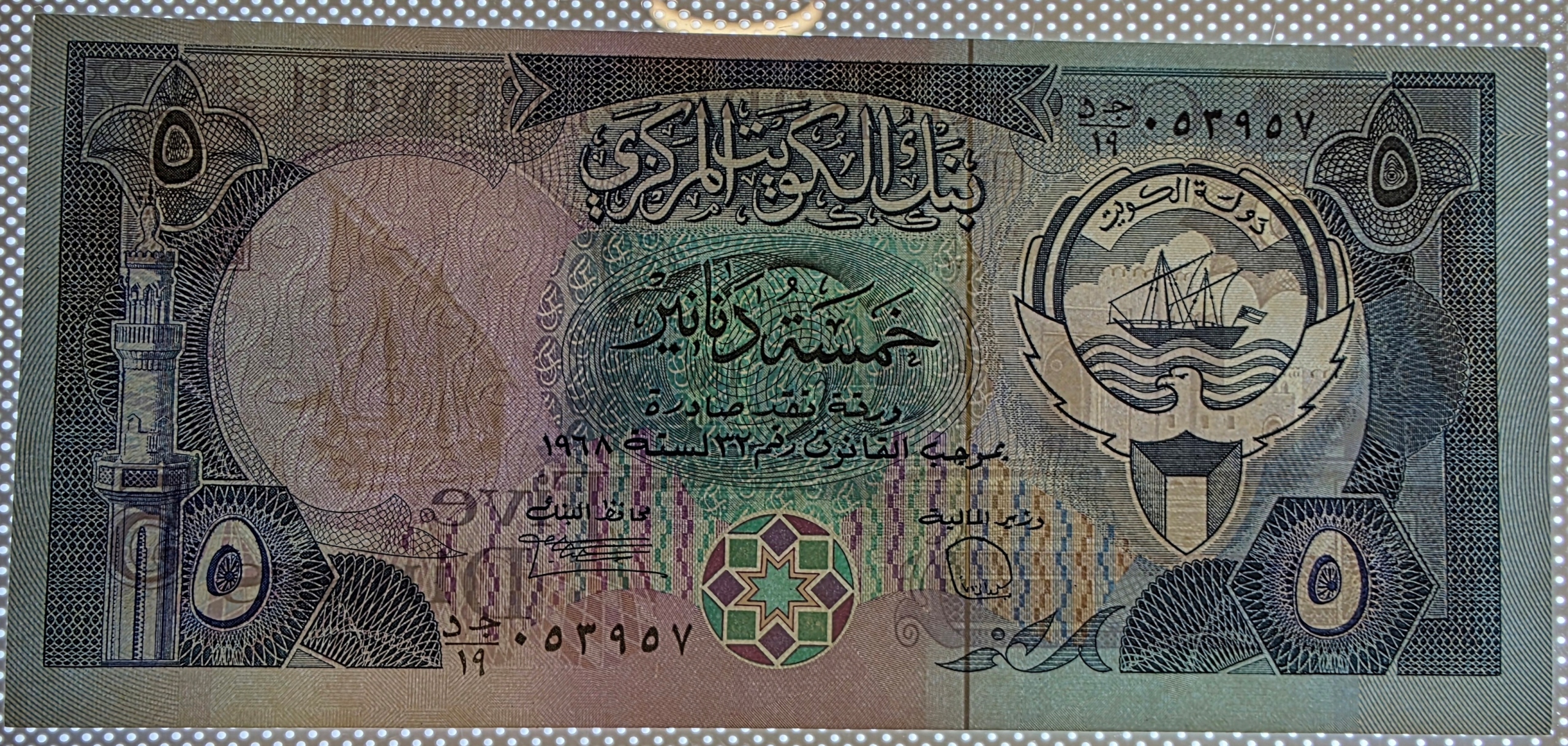 Oryginalny banknot 5 Dinarów Kuwejtu, wyemitowany przez Central Bank of Kuwait, jedna z najbardziej poszukiwanych pozycji z klasycznych emisji arabskich.