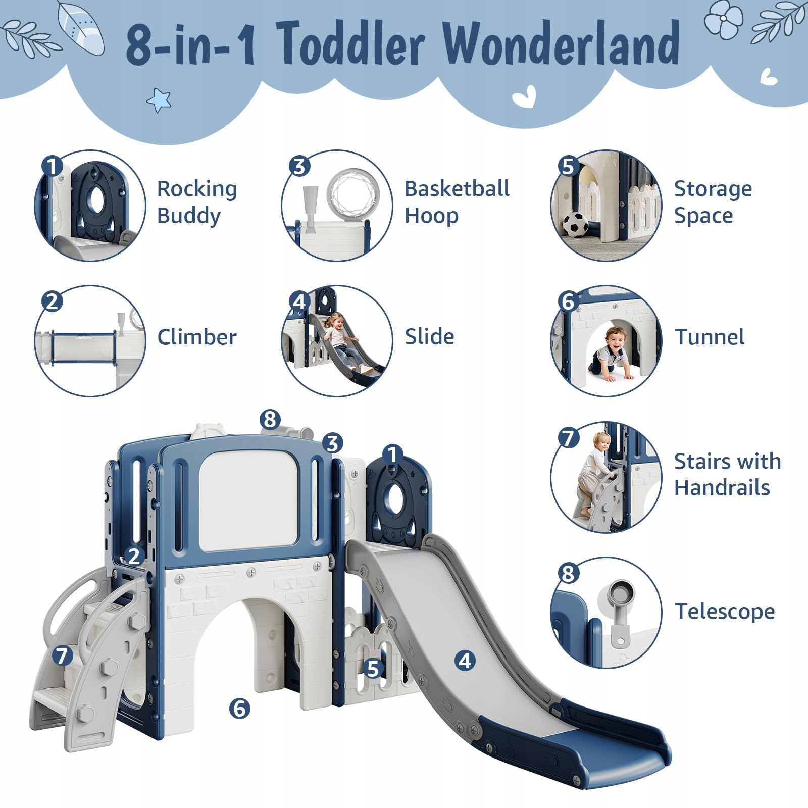 Wielofunkcyjny zestaw do zabawy 8 w 1: ten plac zabaw dla maluchów 8 w 1 oferuje niekończącą się zabawę z tunelem, teleskopem, obręczą do koszykówki, drabinką wspinaczkową i nie tylko — zaprojektowany, aby rosnąć wraz z dzieckiem. Zabawka idealnie nadaje się do użytku wewnątrz i na zewnątrz, pomagając maluchom rozwijać koordynację, siłę i równowagę, zapewniając jednocześnie bezpieczną zabawę. Idealne dla rodziców poszukujących wszechstronnych zabawek wspinaczkowych dla dzieci, nadających się do zabawy w pomieszczeniach i na świeżym powietrzu.