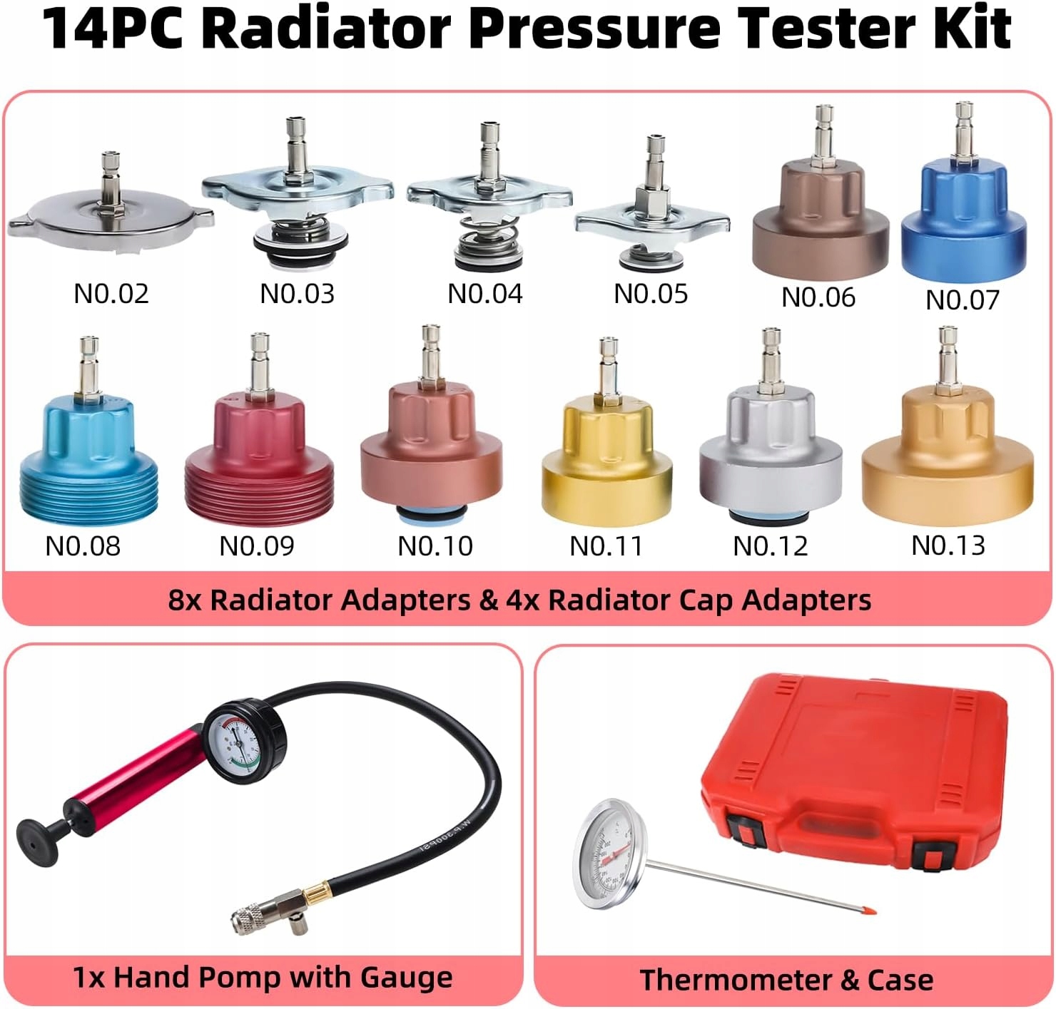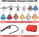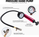 Pompka ręczna i wiele adapterów do chłodnicy: zestaw do wyciskania układu chłodzenia zawiera 8 specjalnych adapterów do chłodnicy, służących do testowania szczelności układu chłodzenia; 4 adaptery do korka chłodnicy, służące do diagnozowania nieszczelności korka chłodnicy. Duży manometr o przekątnej 3 cale (7,6 cm) z łatwą do odczytania skalą od 0 do 35 psi (od 0 do 2,5 bar).