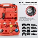 Szeroka kompatybilność: urządzenie do pomiaru ciśnienia w chłodnicy i próżniowy wlew płynu chłodzącego są odpowiednie dla różnych typów pojazdów, w tym samochodów osobowych, SUV-ów, pickupów, ciężarówek i minivanów. Kompatybilne z markami: Audi, VW, Ford, BMW, Mercedes-Benz, Peugeot, Mitsubishi, Citroen, Renault, Fiat, Alfa Romeo, Honda, Volvo itp.