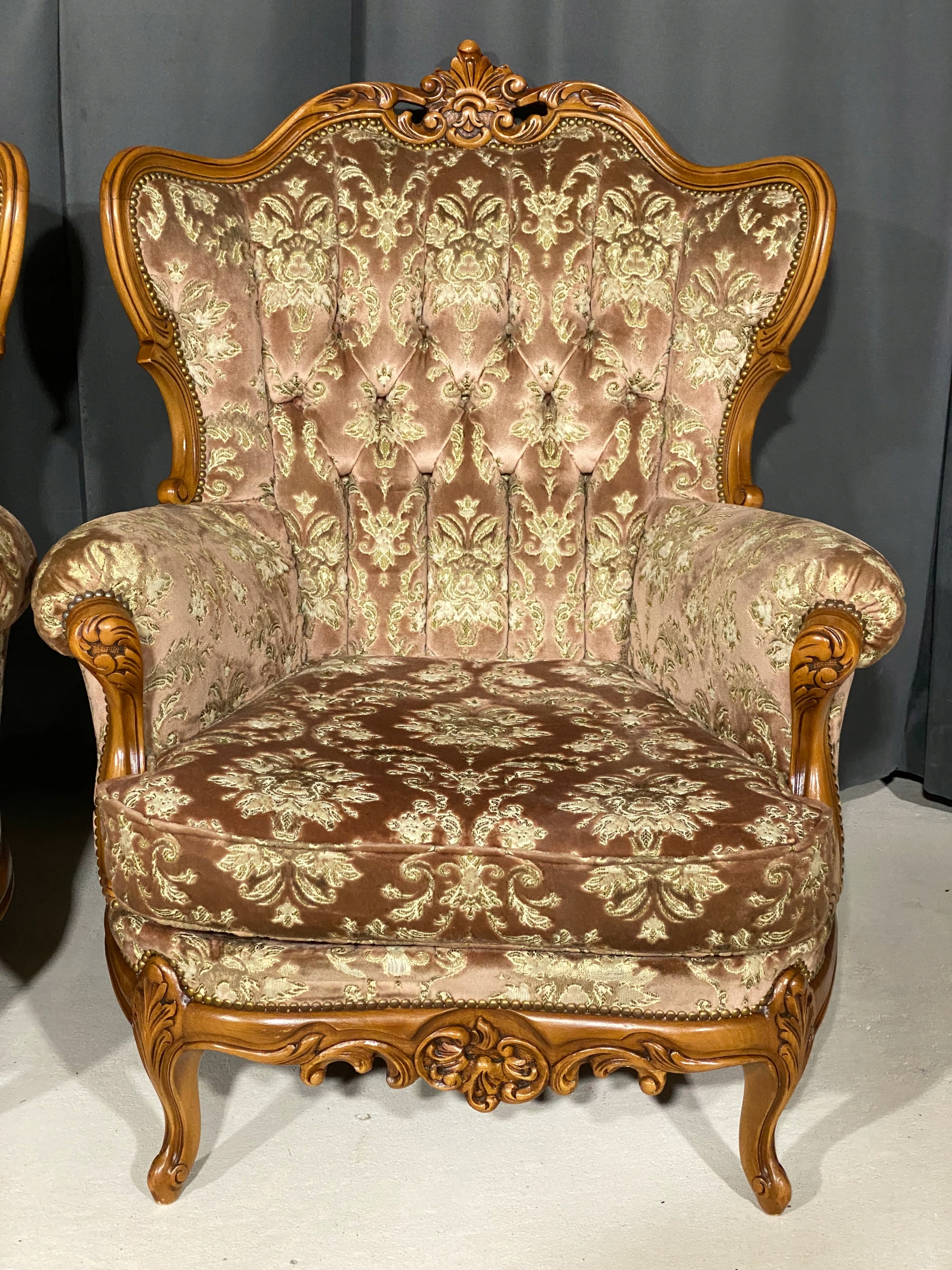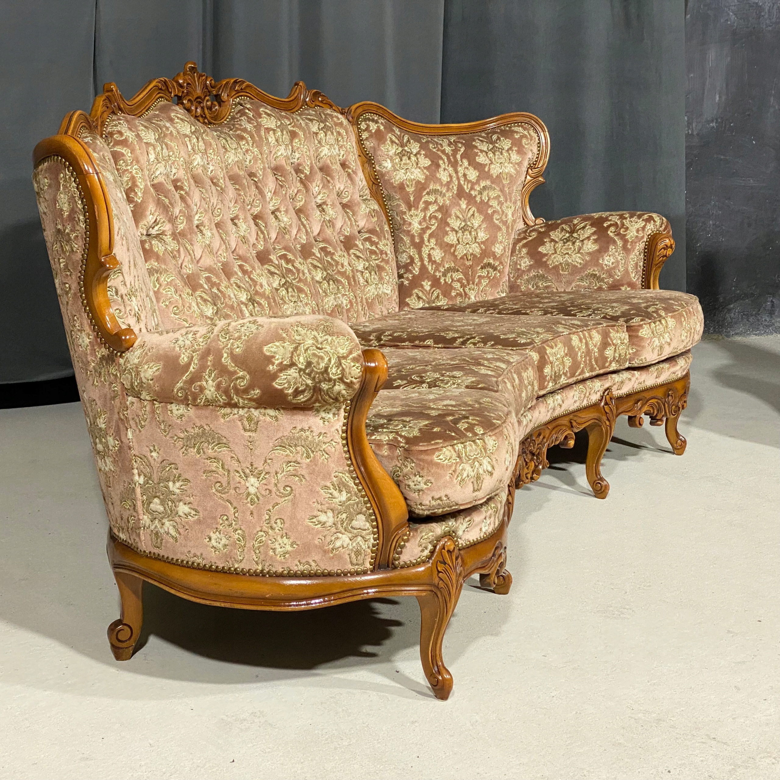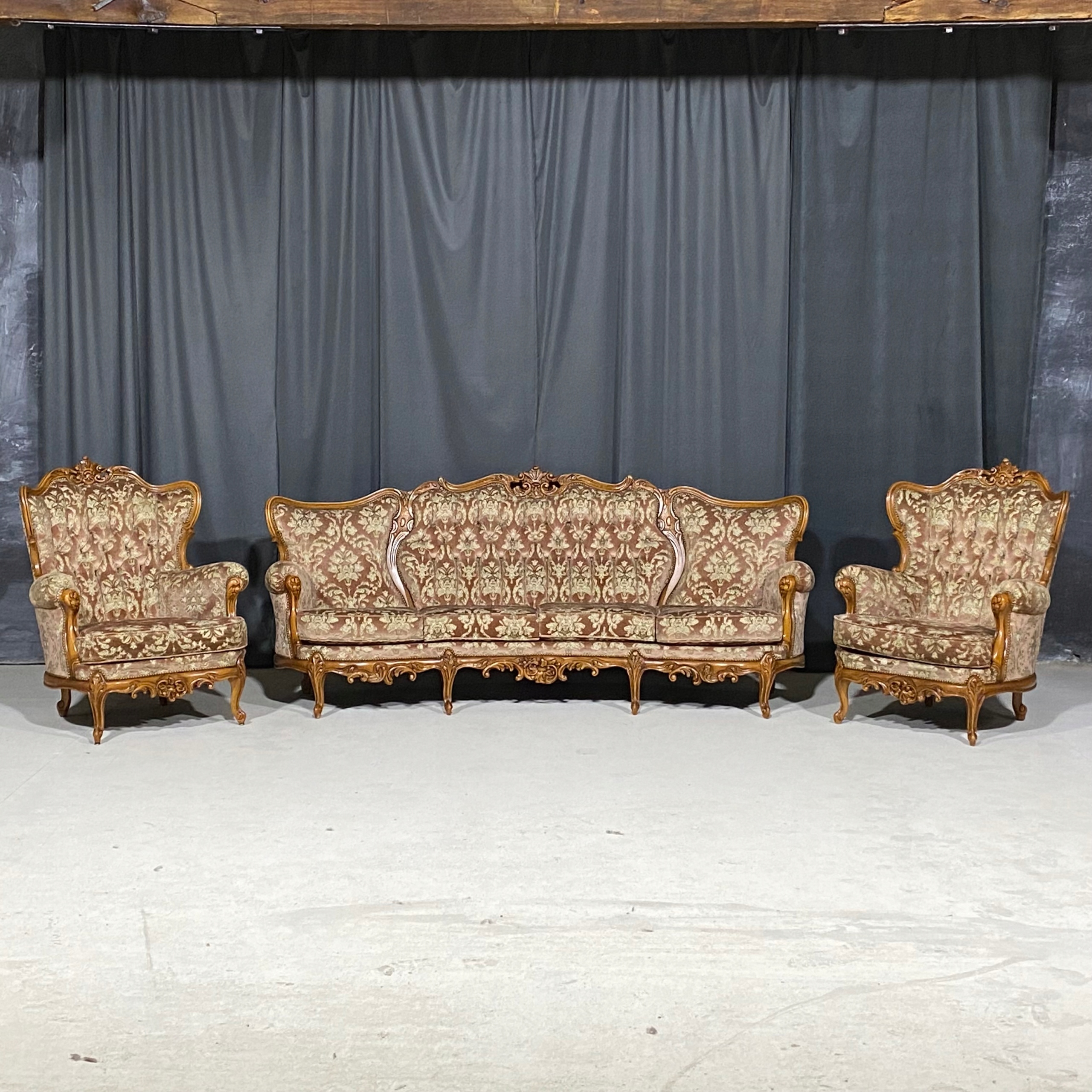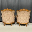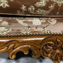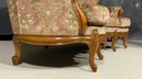 Meble wykonane są z litego drewna, bogato rzeźbionego – z charakterystycznymi motywami rocaille, liśćmi akantu i finezyjnymi wygięciami nóg typu „cabriole”. Tapicerka w oryginalnym, klasycznym wzorze floralnym z pikowaniem oparć, doskonale oddaje charakter epoki.