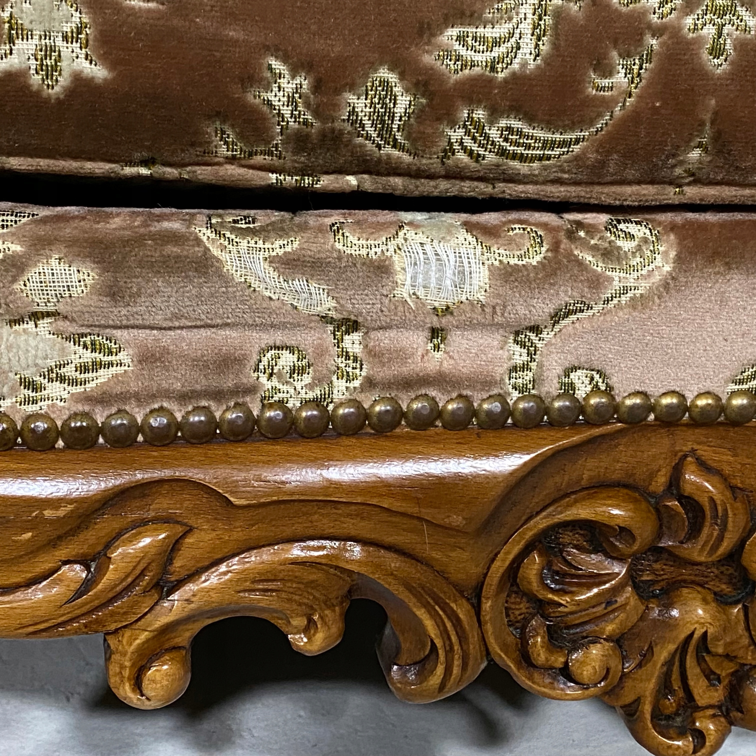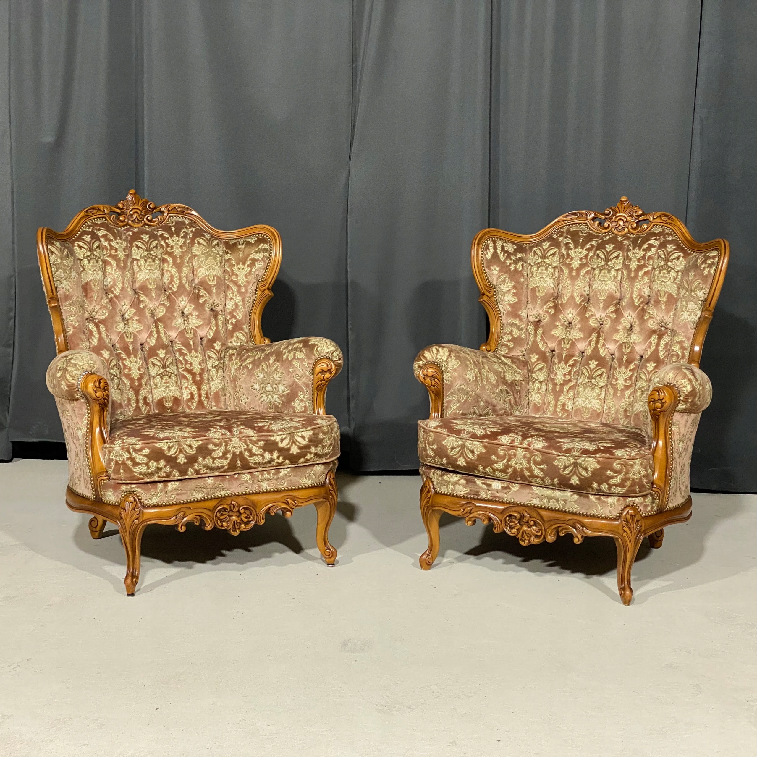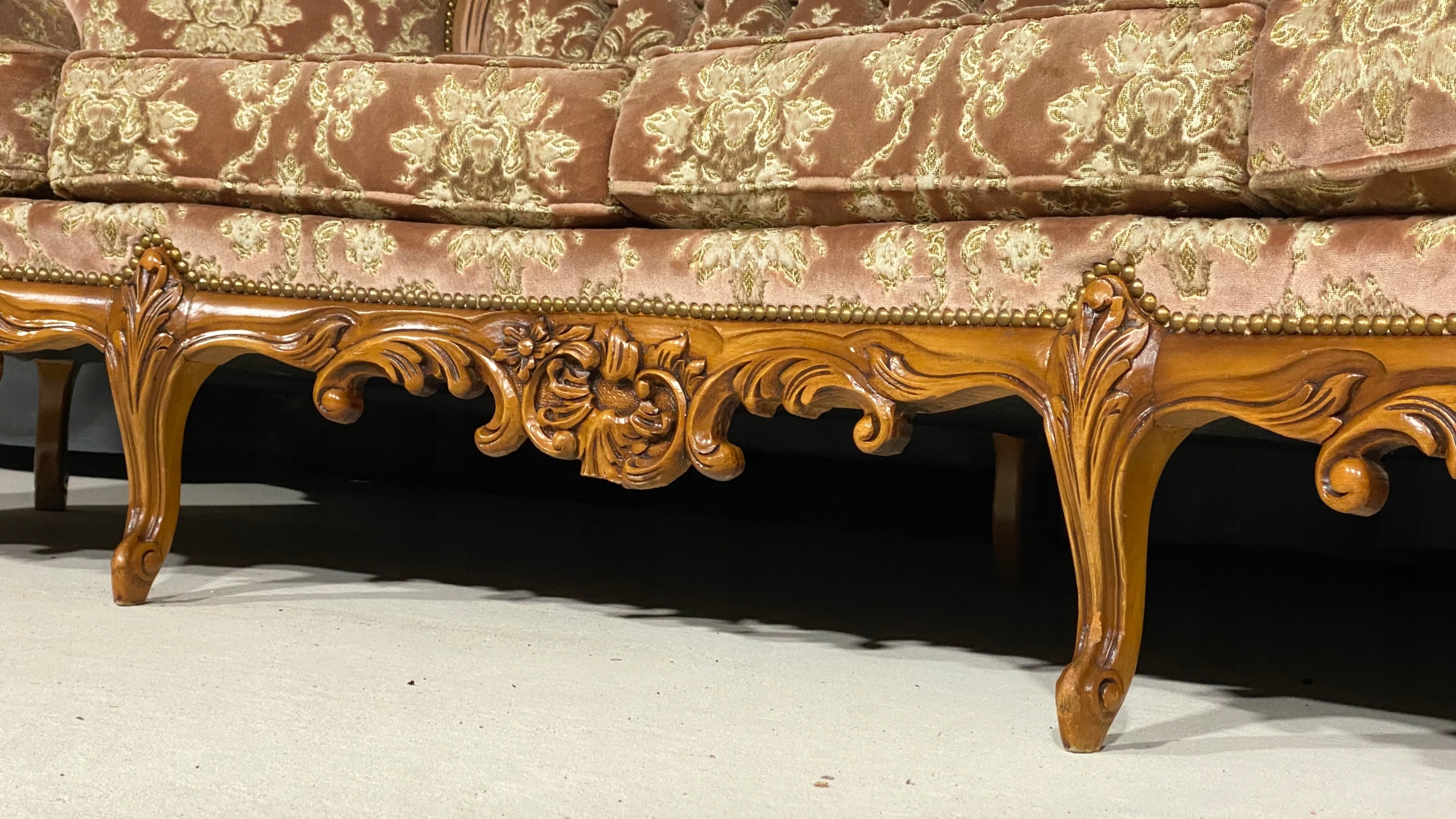 Meble wykonane są z litego drewna, bogato rzeźbionego – z charakterystycznymi motywami rocaille, liśćmi akantu i finezyjnymi wygięciami nóg typu „cabriole”. Tapicerka w oryginalnym, klasycznym wzorze floralnym z pikowaniem oparć, doskonale oddaje charakter epoki.