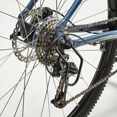 Dzięki zmianie biegów tylko jedną manetką, napęd jednorzędowy ułatwia życie... jak i stopniowanie przełożeń, pomyślane pod kątem pokonywania niewielkich wzniesień. Oto szczegóły napędu tego roweru: - cynglowa manetka zmiany biegów BTWIN SL569, - kaseta 9-rzędowa MICROSHIFT H092, - zębatki 11/36, - pojedyncza koronka 36 zębów, - łańcuch KMC X9 ze spinką, - tylna przerzutka BTWIN RD M46-L, - i obręcz zabezpieczająca łańcuch przed spadaniem.