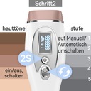 Pięć programowanych poziomów intensywności światła dopasowuje się do wszystkich typów skóry. Dwa tryby pracy: manualny do precyzyjnej depilacji stref bikini i twarzy, automatyczny do dużych powierzchni jak nogi czy plecy.