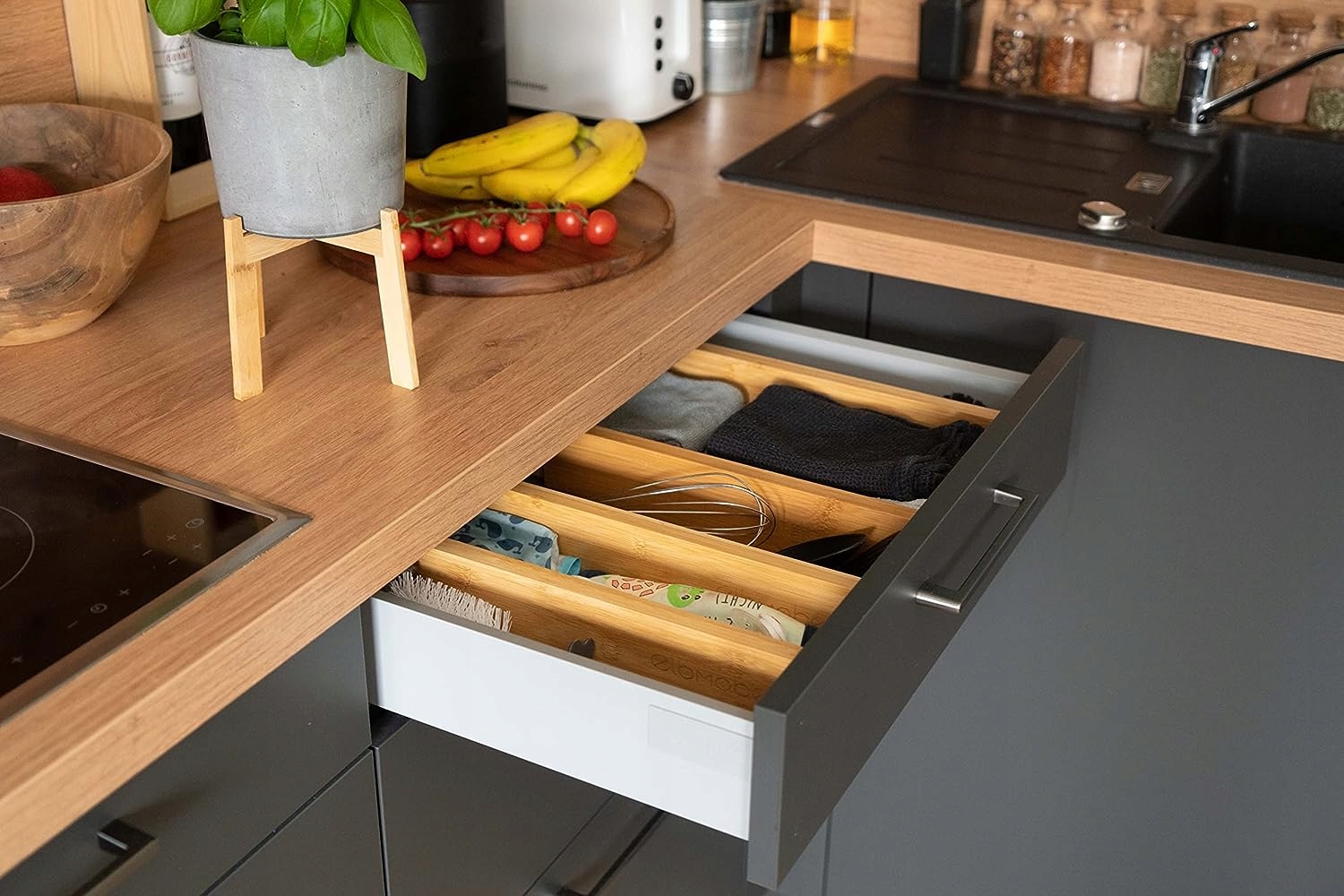 Warto podkreślić, że przekładki do szuflad charakteryzują się dużą uniwersalnością. Mogą zostać dostosowane do większości dostępnych na rynku szuflad o szerokości od 44 do 56 cm.
