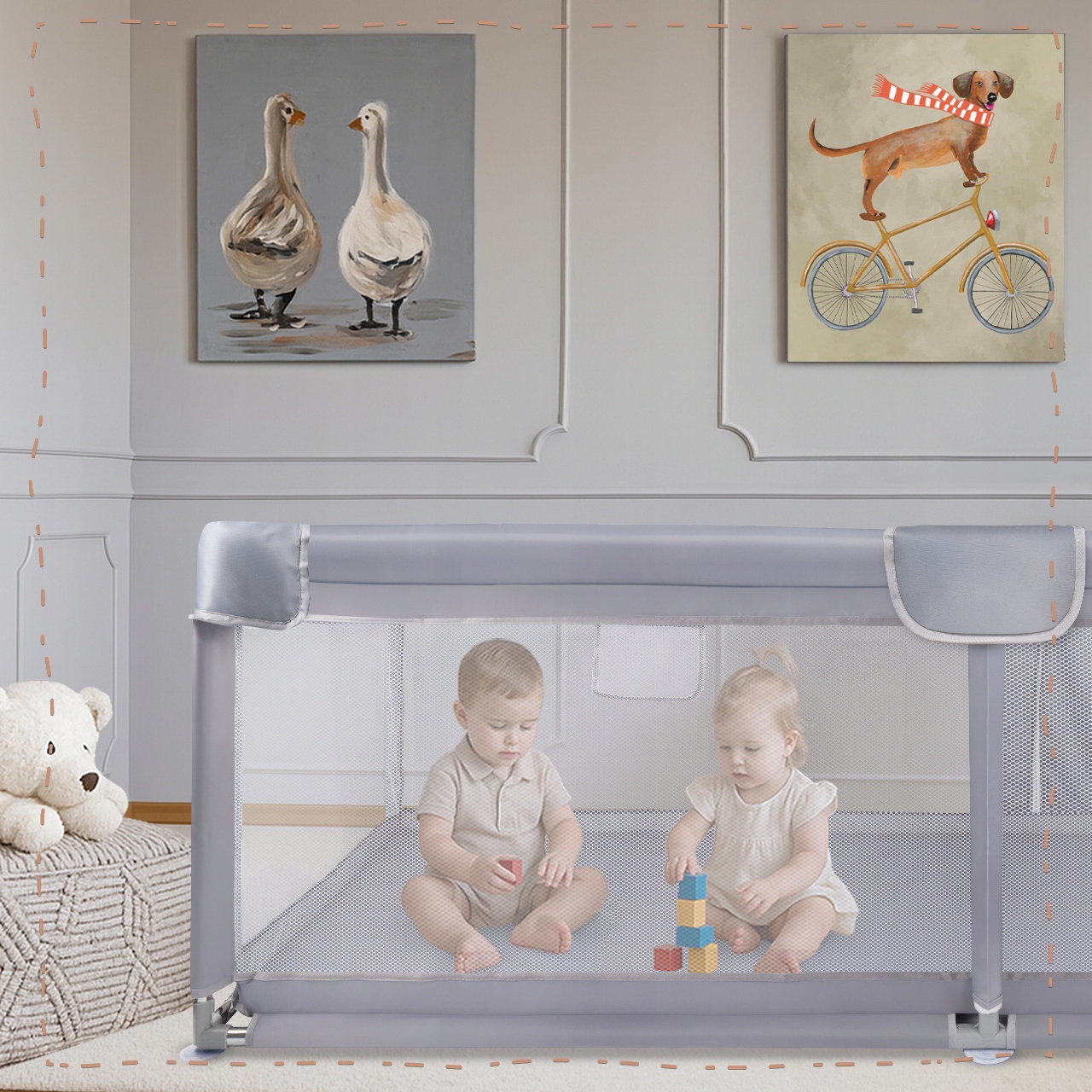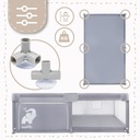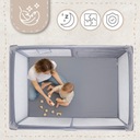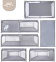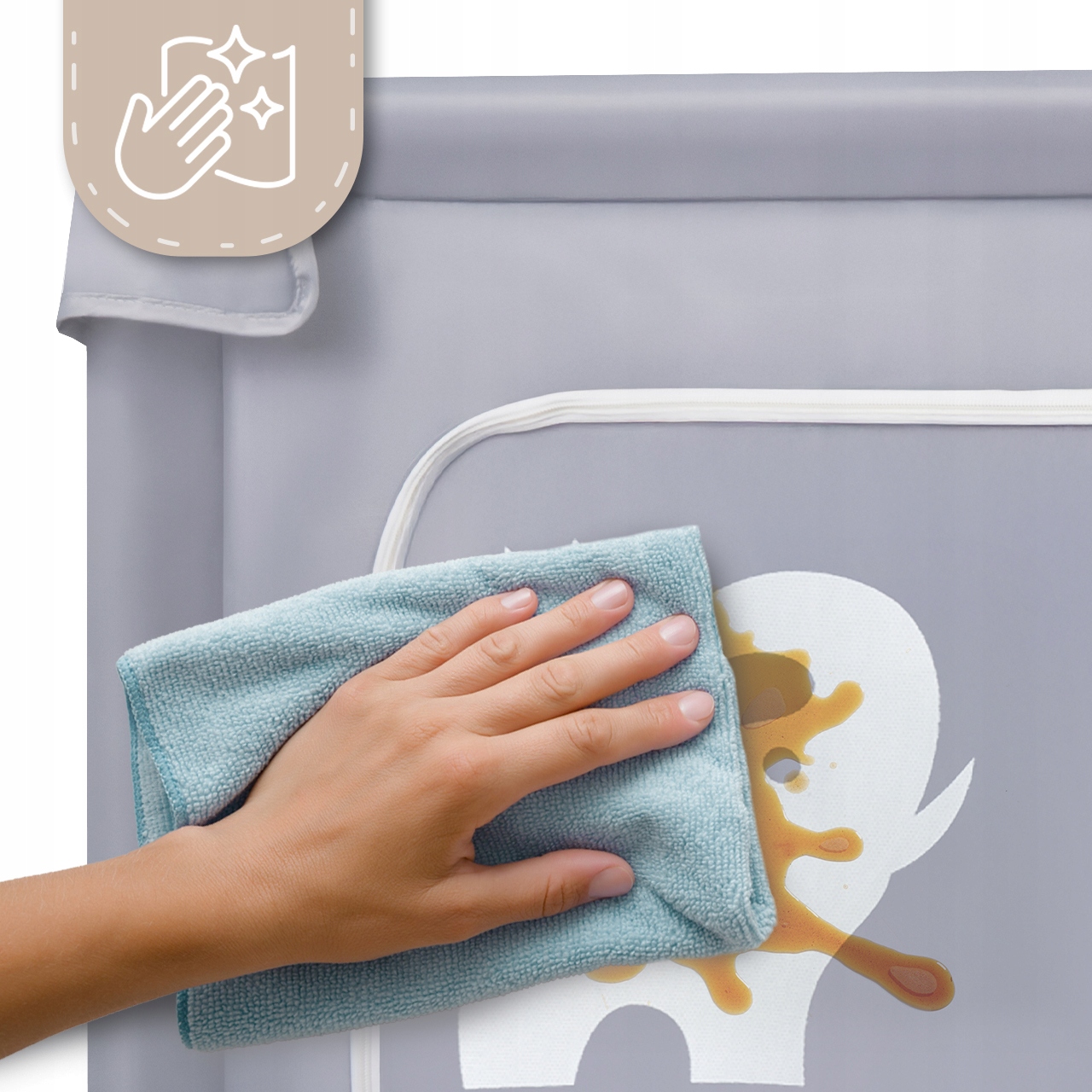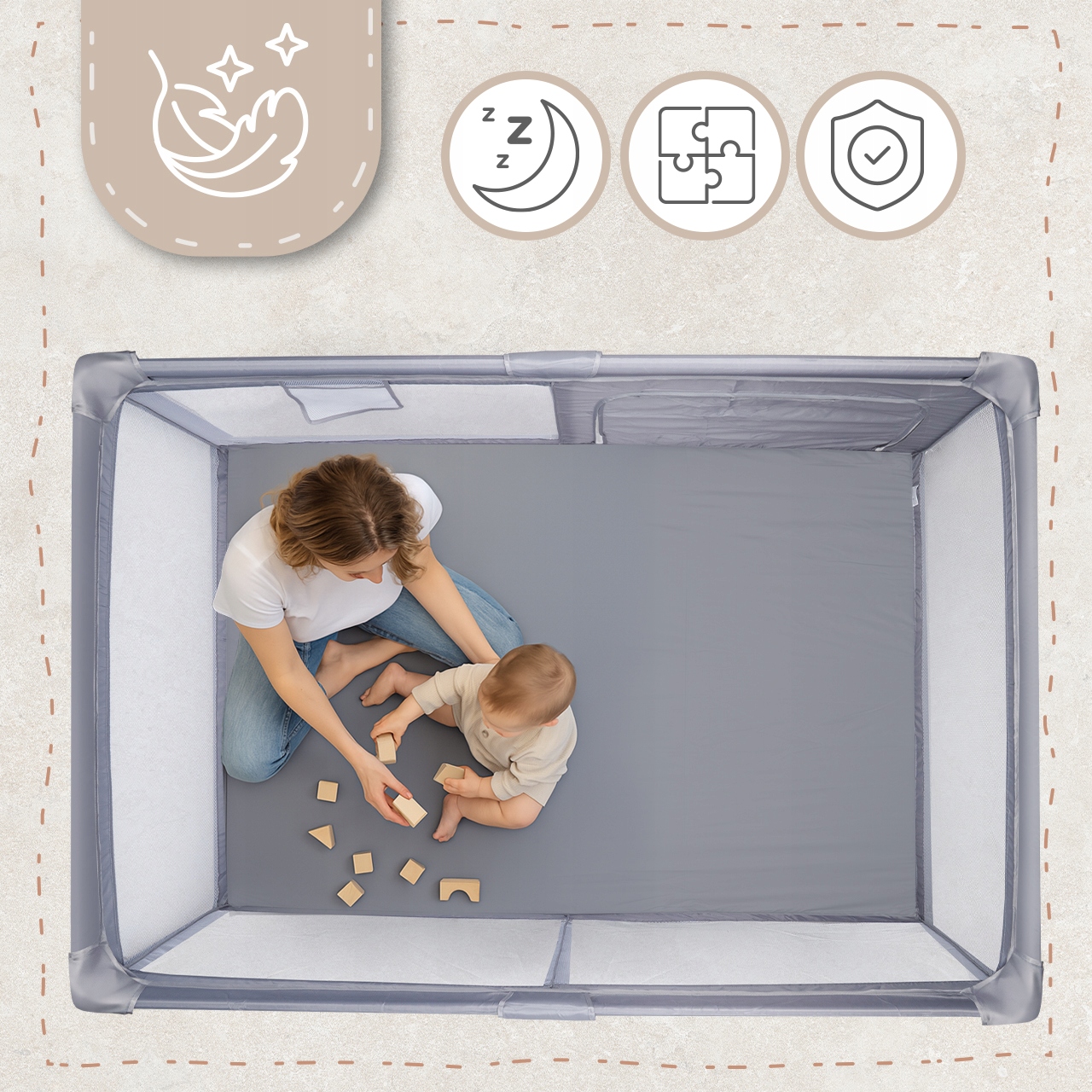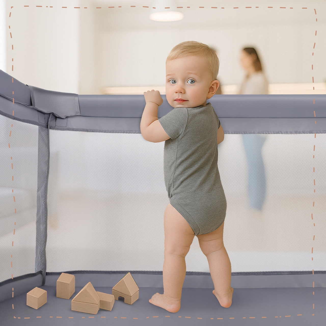 Siateczkowe ścianki zastosowane w 4 bokach kojca zapewniają stały przepływ powietrza i doskonałą widoczność – zarówno dla rodzica, jak i dziecka. Dzięki nim możesz bez przeszkód obserwować malucha, a dziecko czuje się bezpiecznie, widząc otoczenie. Miękka, elastyczna siateczka stanowi doskonałą alternatywę dla twardych barierek – zmniejszając ryzyko uderzeń podczas przewrotów, raczkowania czy prób wstawania. To idealna przestrzeń do nauki ruchu i bezpiecznej zabawy bez barier.
