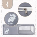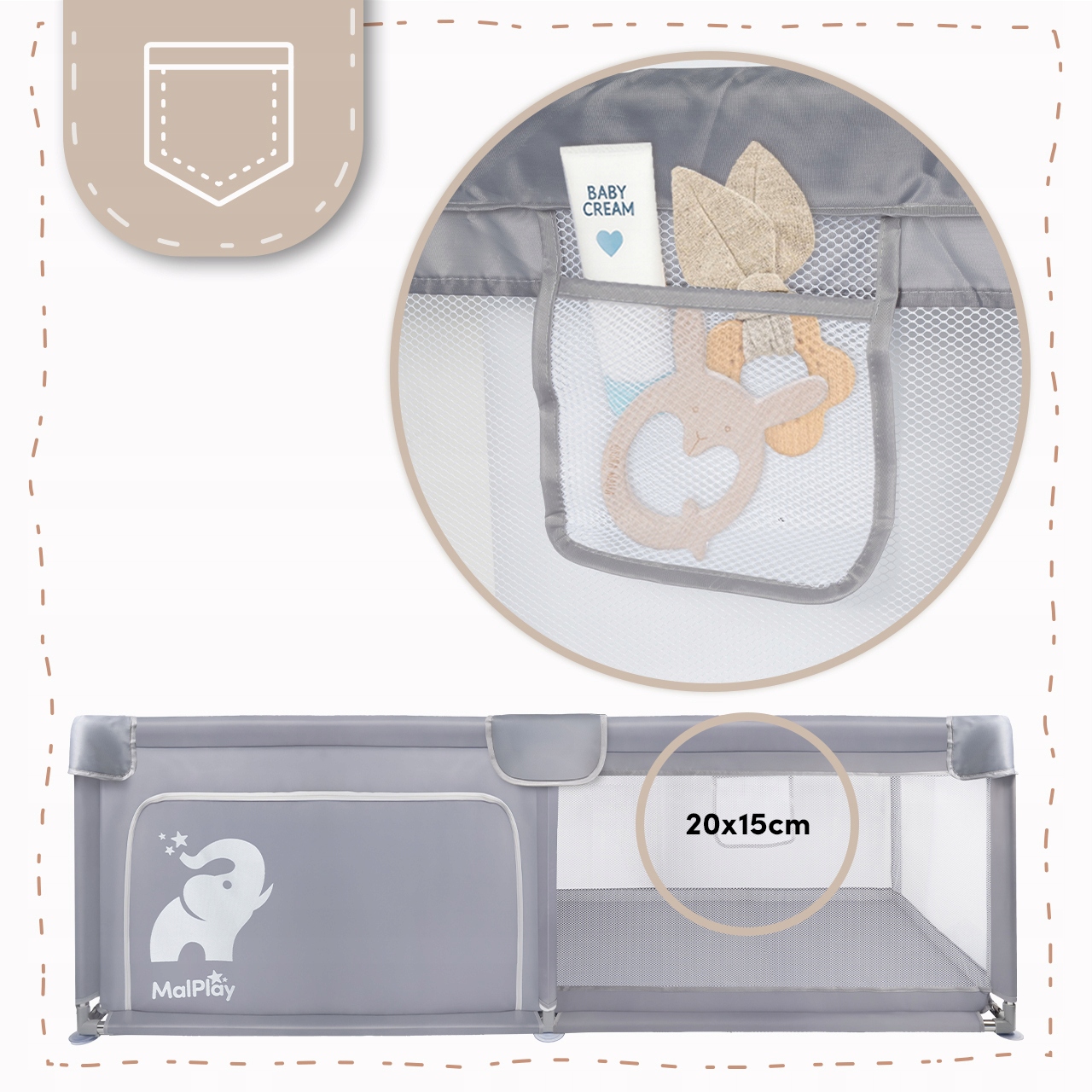 Kojec Kivo został wyposażony w praktyczną kieszonkę z siateczki, umieszczoną na jednej ze ścianek bocznych. Dzięki przeźroczystemu materiałowi, z łatwością można zobaczyć zawartość kieszeni, co ułatwia szybki dostęp do najpotrzebniejszych drobiazgów, takich jak krem dla dziecka, gryzaki czy małe zabawki. To wygodne rozwiązanie pomaga zachować porządek i mieć wszystkie niezbędne akcesoria zawsze pod ręką.