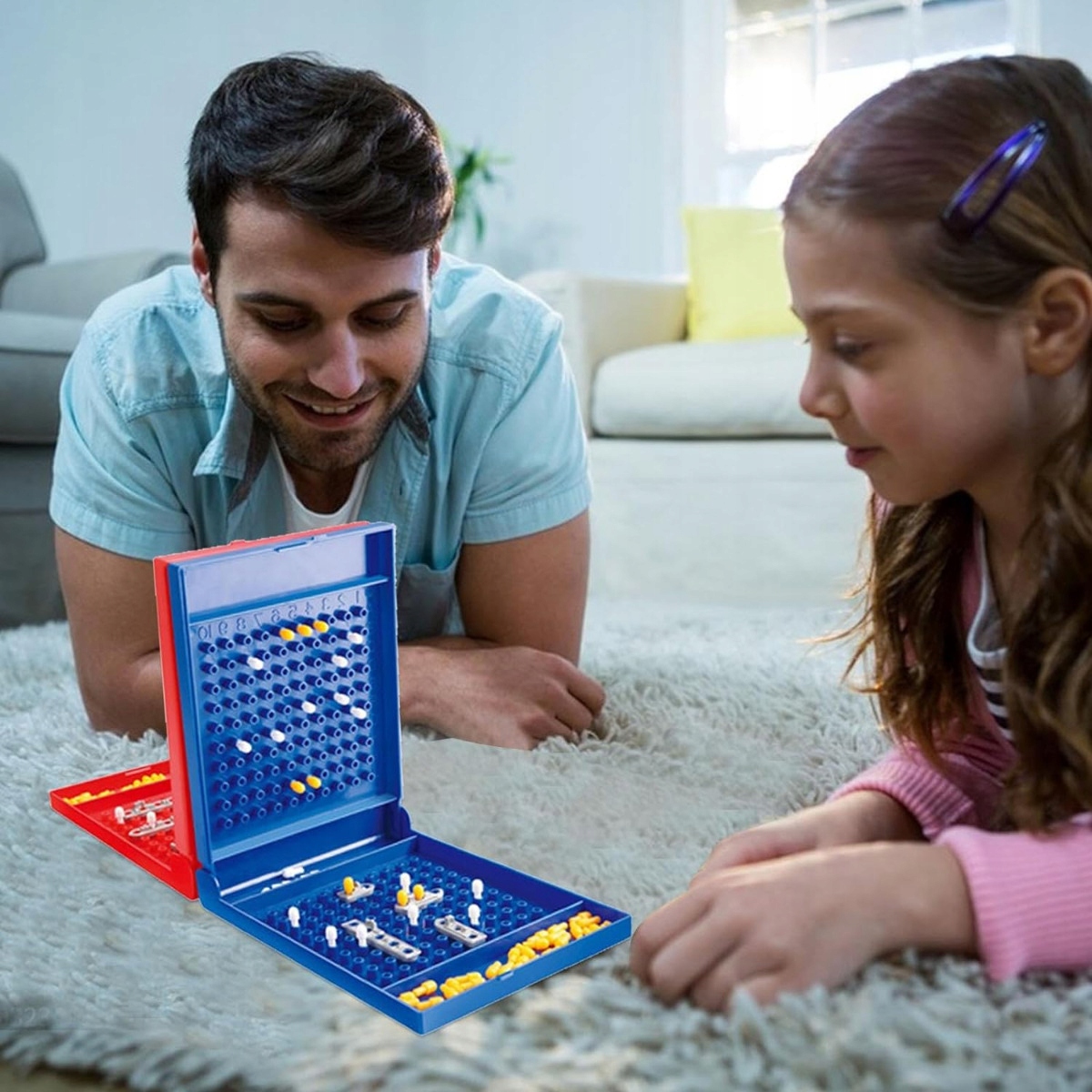 Zasady gry są proste - każdy gracz rozmieszcza własne statki na planszy po swojej stronie. Statki nie mogą się stykać (musi być między nimi przynajmniej odstęp jednego pola). Następnie po kolei, gracze "strzelają" w pole przeciwnika - np. mówią pole "A4" - jeśli przeciwnik na tym polu posiada swój statek, mówi "trafiony" i gracz zaznacza kolorowym słupkiem dane pole i ma prawo do jeszcze jednego typowania pola dzięki temu, że trafił (tak długo, aż trafi na puste pole przeciwnika, który mówi "pudło" i teraz on typuje pole). Gra kończy się, gdy jeden z graczy zatopi wszystkie statki przeciwnika, tym samym wygrywając. Na panelu poziomym, każdy z graczy ma swoje statki, a na panelu pionowym oznacza trafienia/pudła statków przeciwnika.