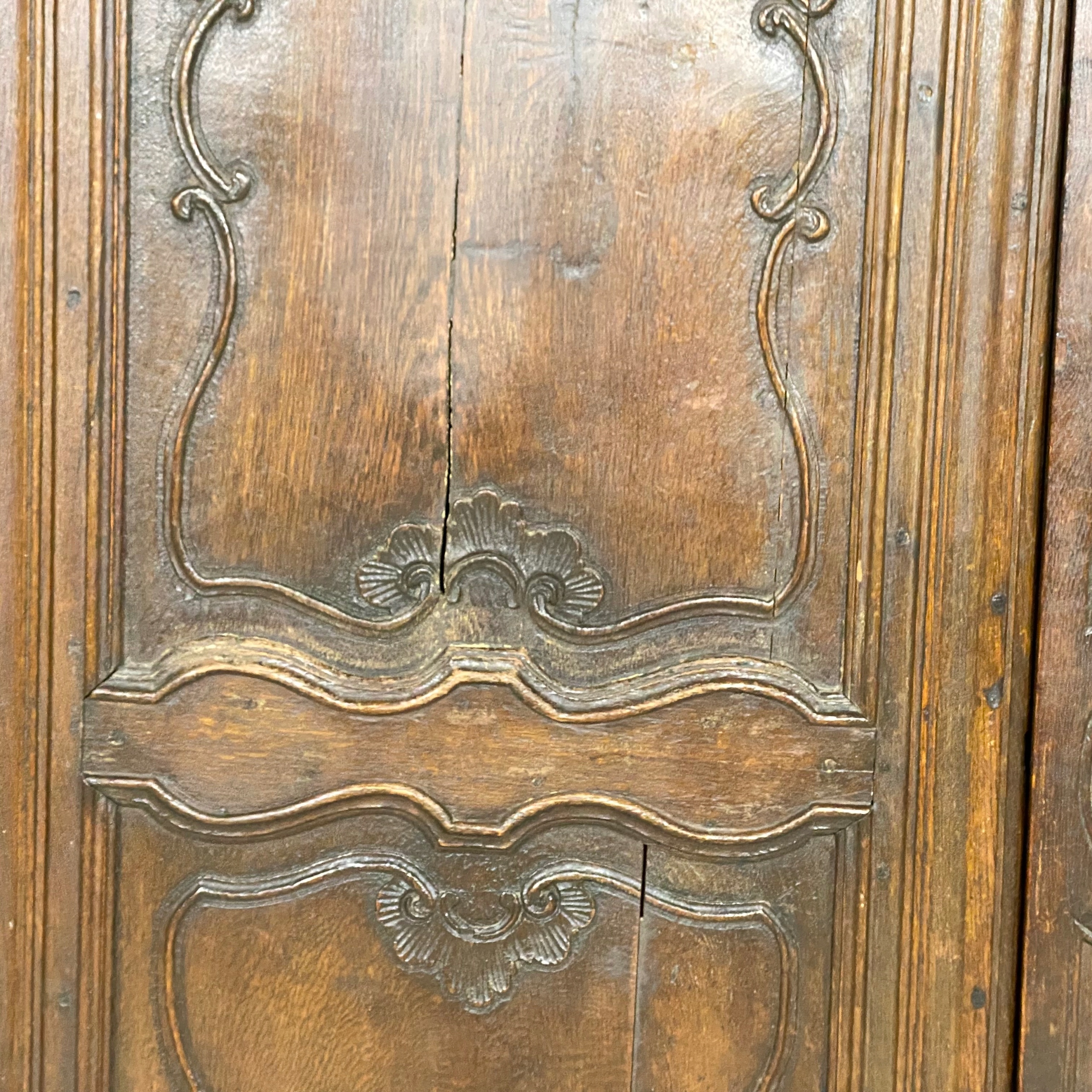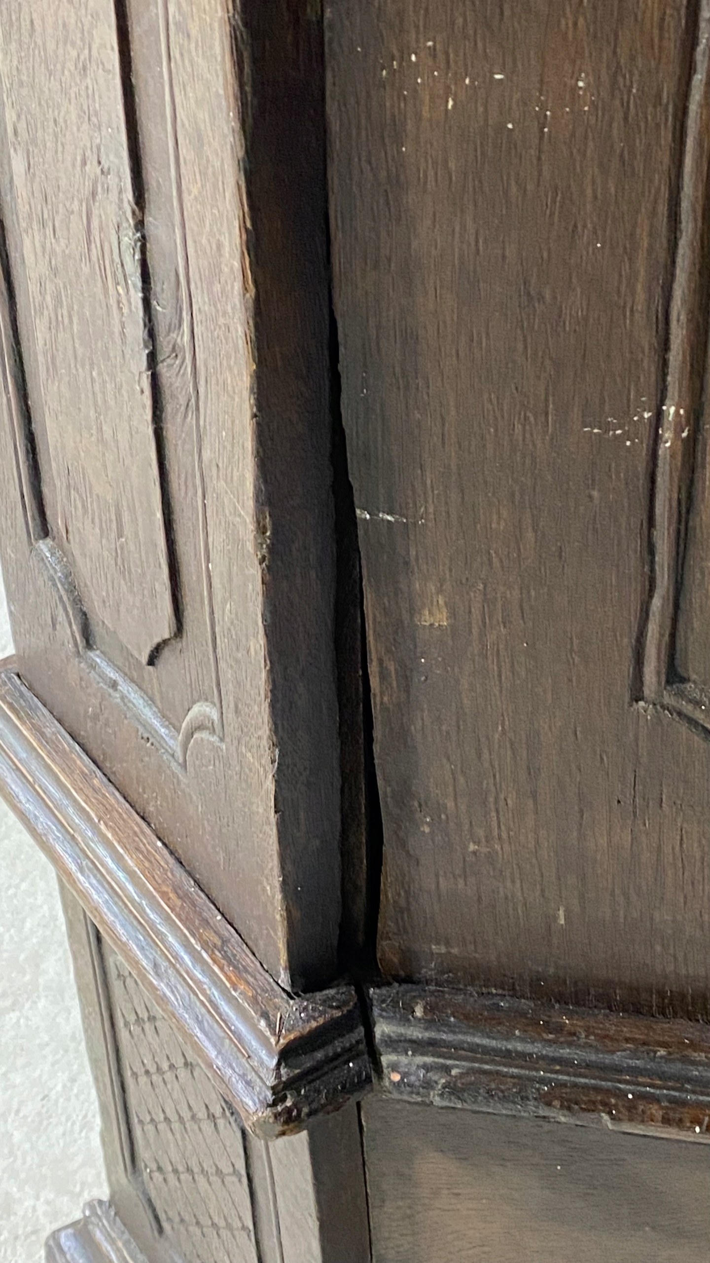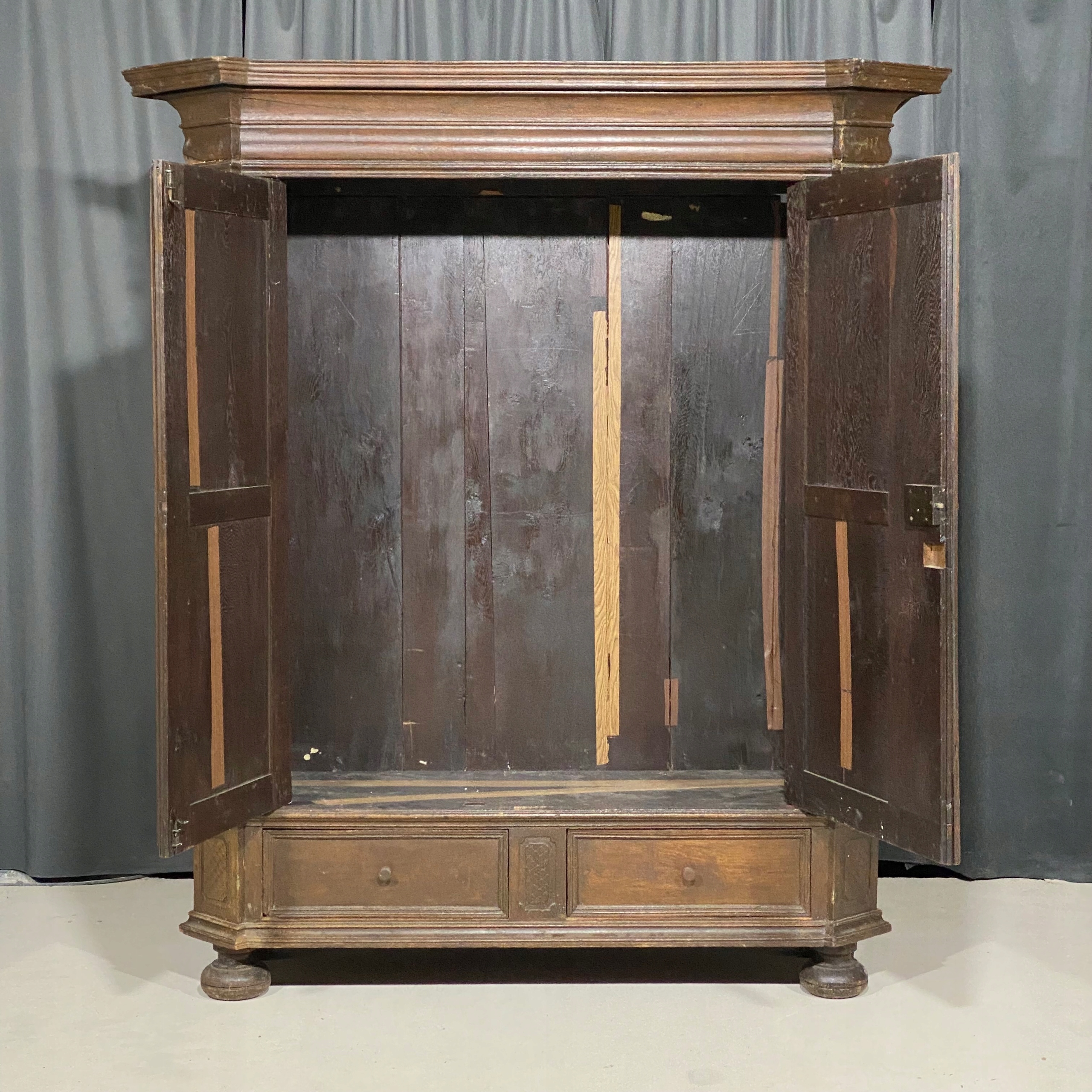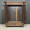 Antyczna rzeźbiona szafa z litego drewna w stanie do renowacji.
