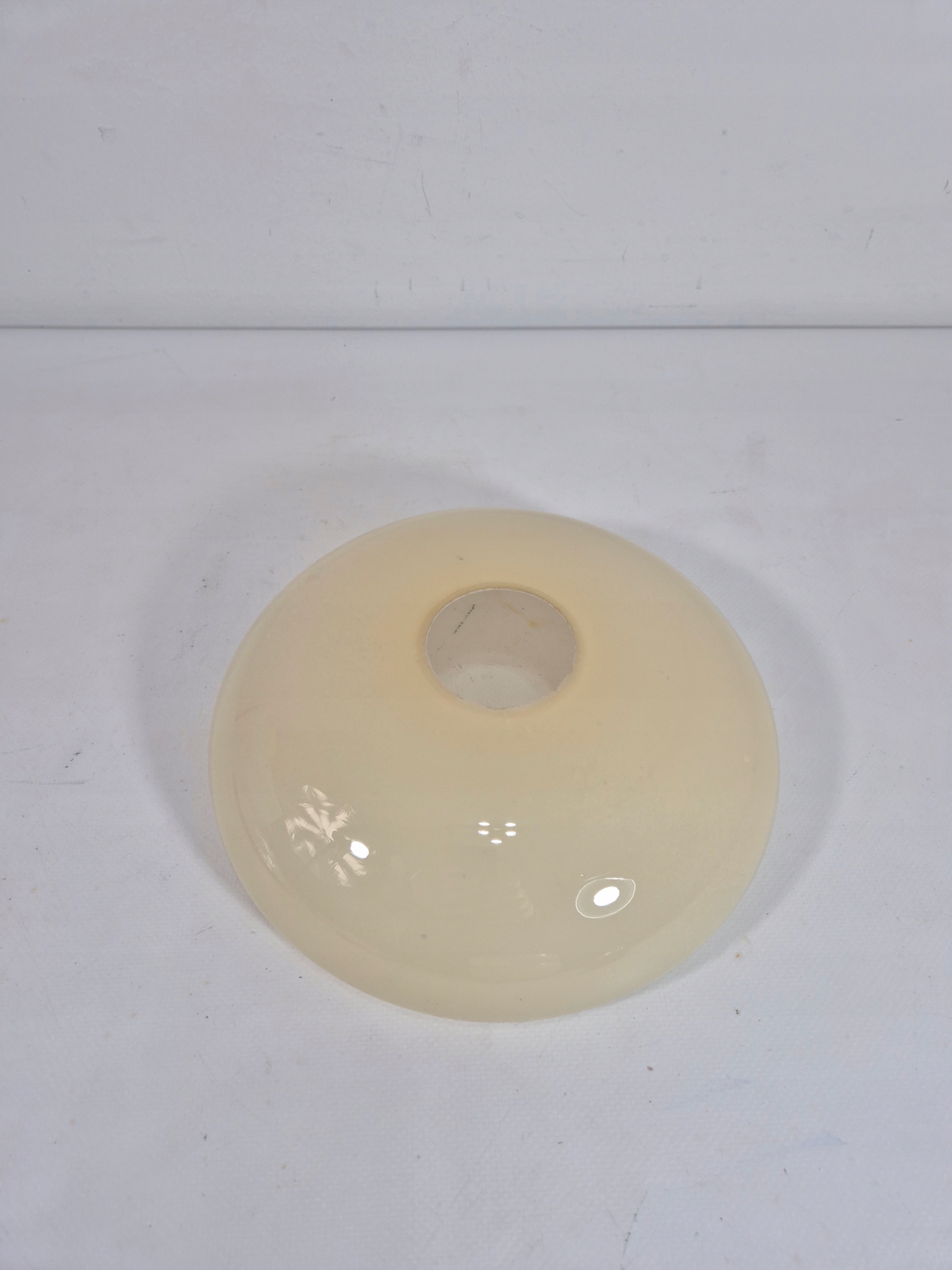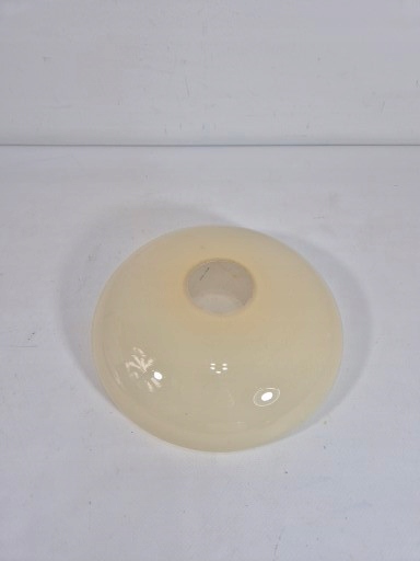 Klosz szklany w kolorze ekri Art Deco wymiary to szerokość 19cm wysokość 7cm otwór montażowy 5cm.Stan bardzo dobry.