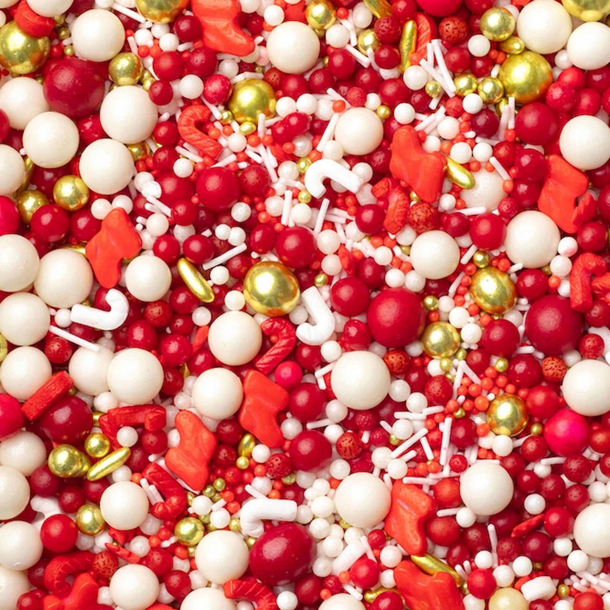 Mieszanka zawiera różnorodne kształty i wielkości – od dużych perełek, przez chrupiące kuleczki, po dekoracyjne elementy w odcieniach czerwieni i złota. Dzięki temu każdy deser nabiera głębi i efektu 3D, który podkreśla świąteczną atmosferę.