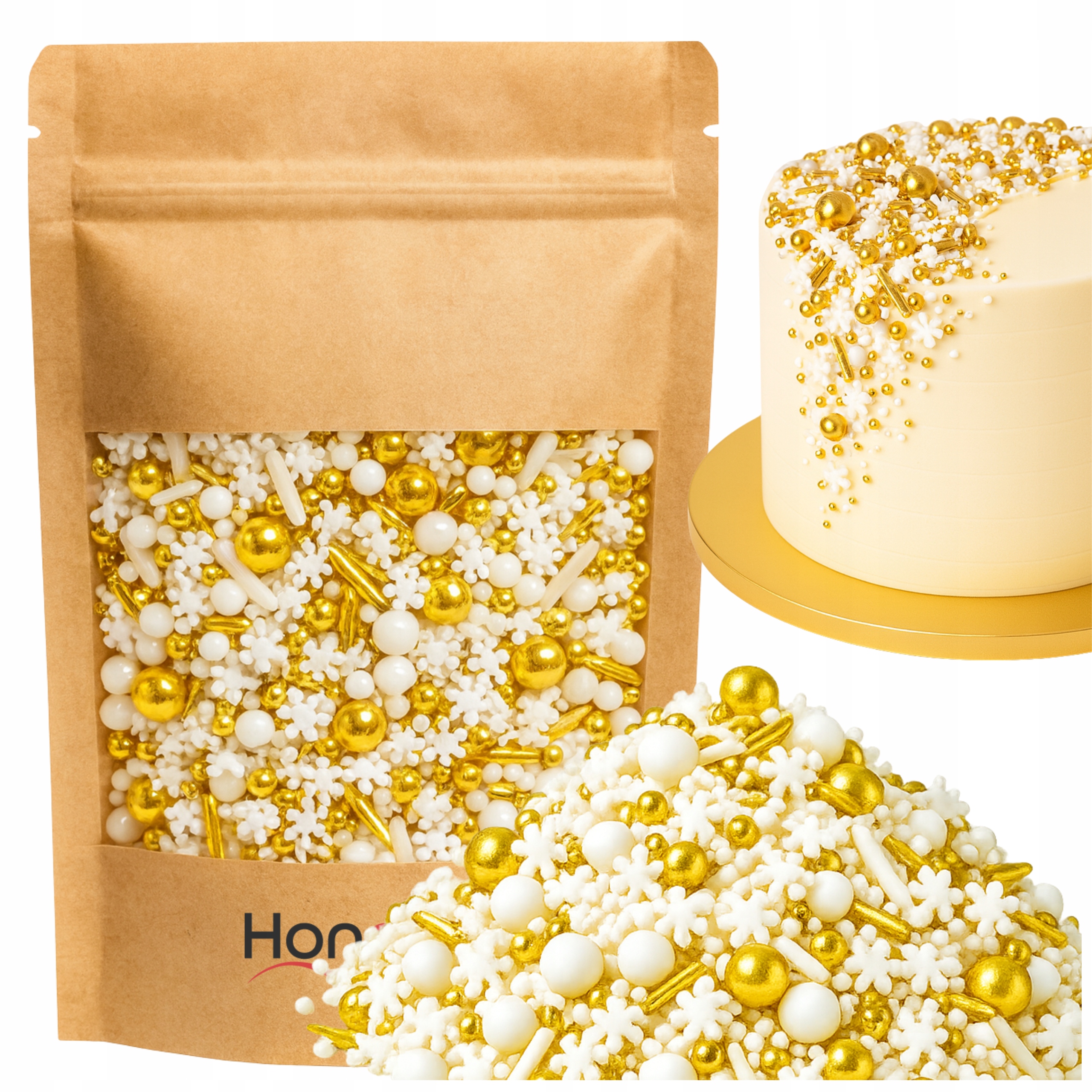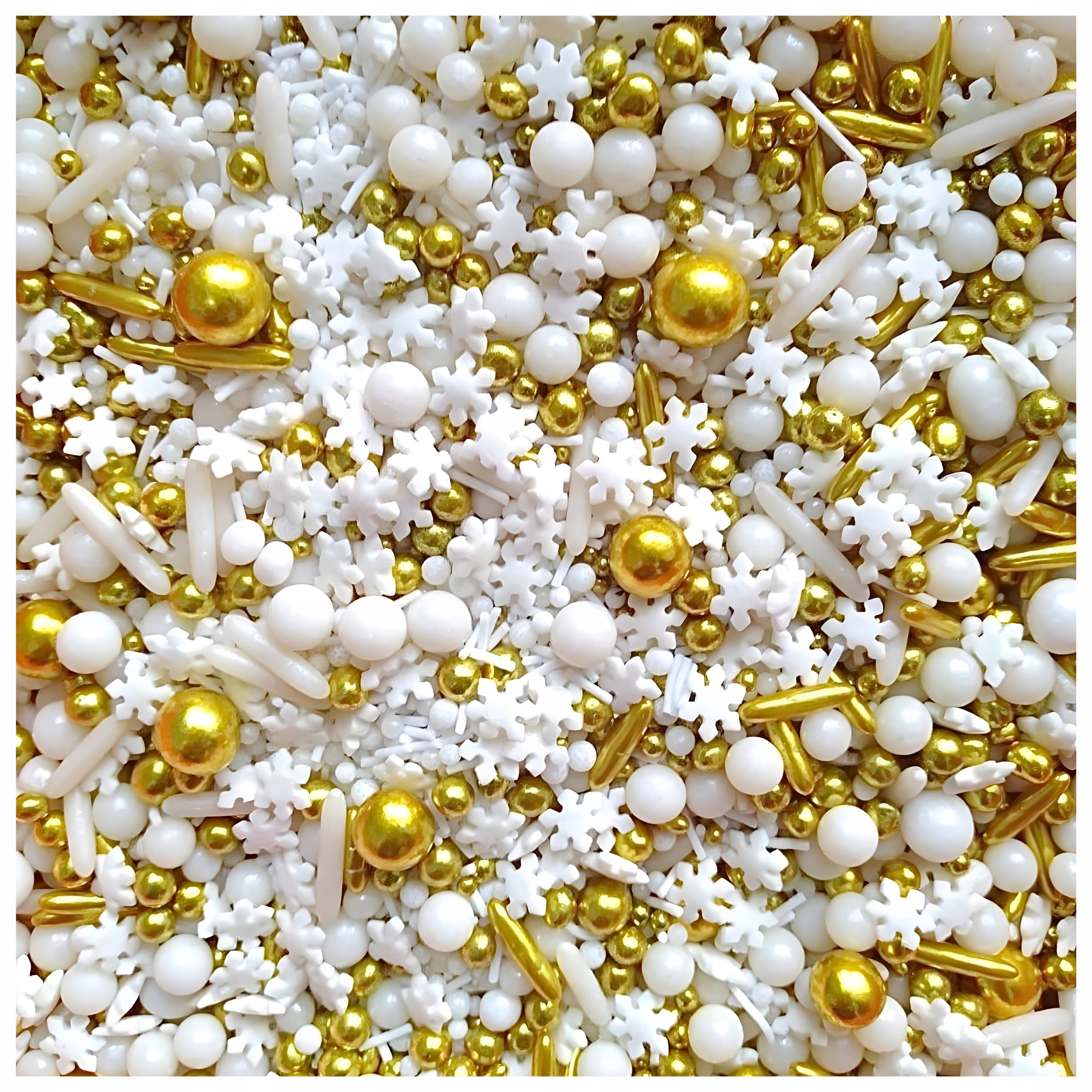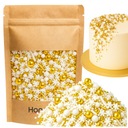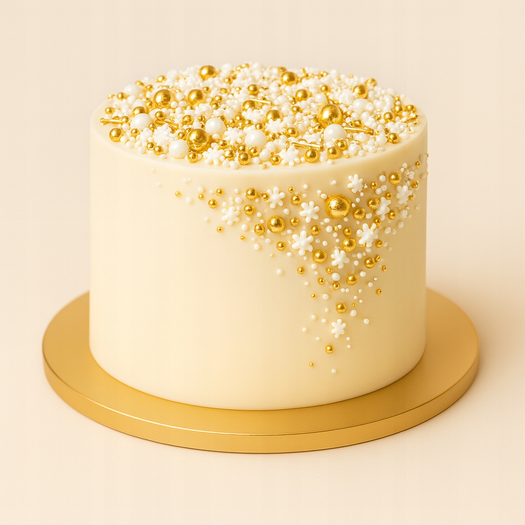 Ta zachwycająca mieszanka łączy w sobie śnieżnobiałe cukrowe płatki, kulki w różnych rozmiarach oraz połyskujące złote dodatki, tworząc wyjątkowy, luksusowy efekt na każdym deserze. Idealnie sprawdzi się w okresie zimowym, na świątecznych wypiekach, tortach okolicznościowych, cake popsach czy muffinkach.