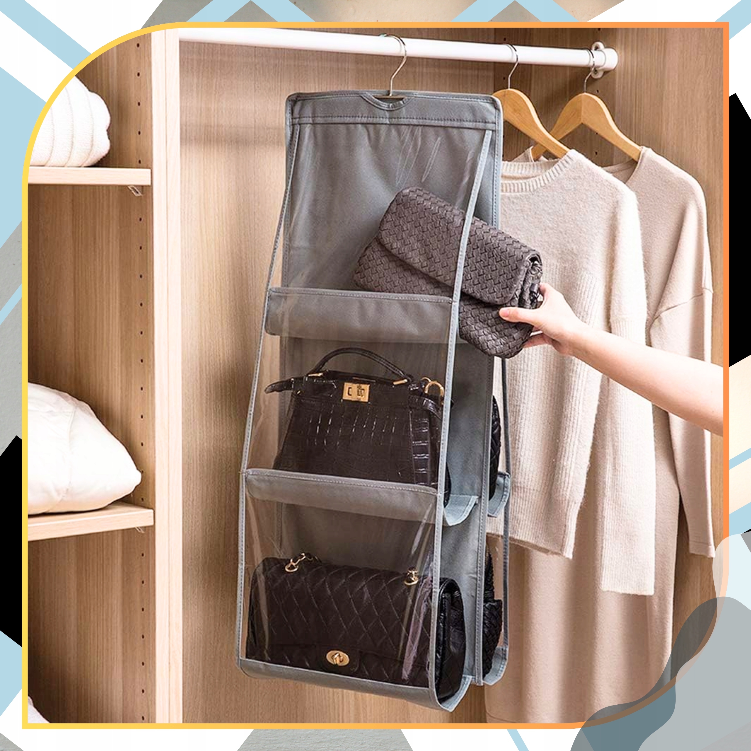 Pozwala na uporządkowanie i schowanie torebek w jednym miejscu i uniknięcie ich rozrzucenia po całej szafie